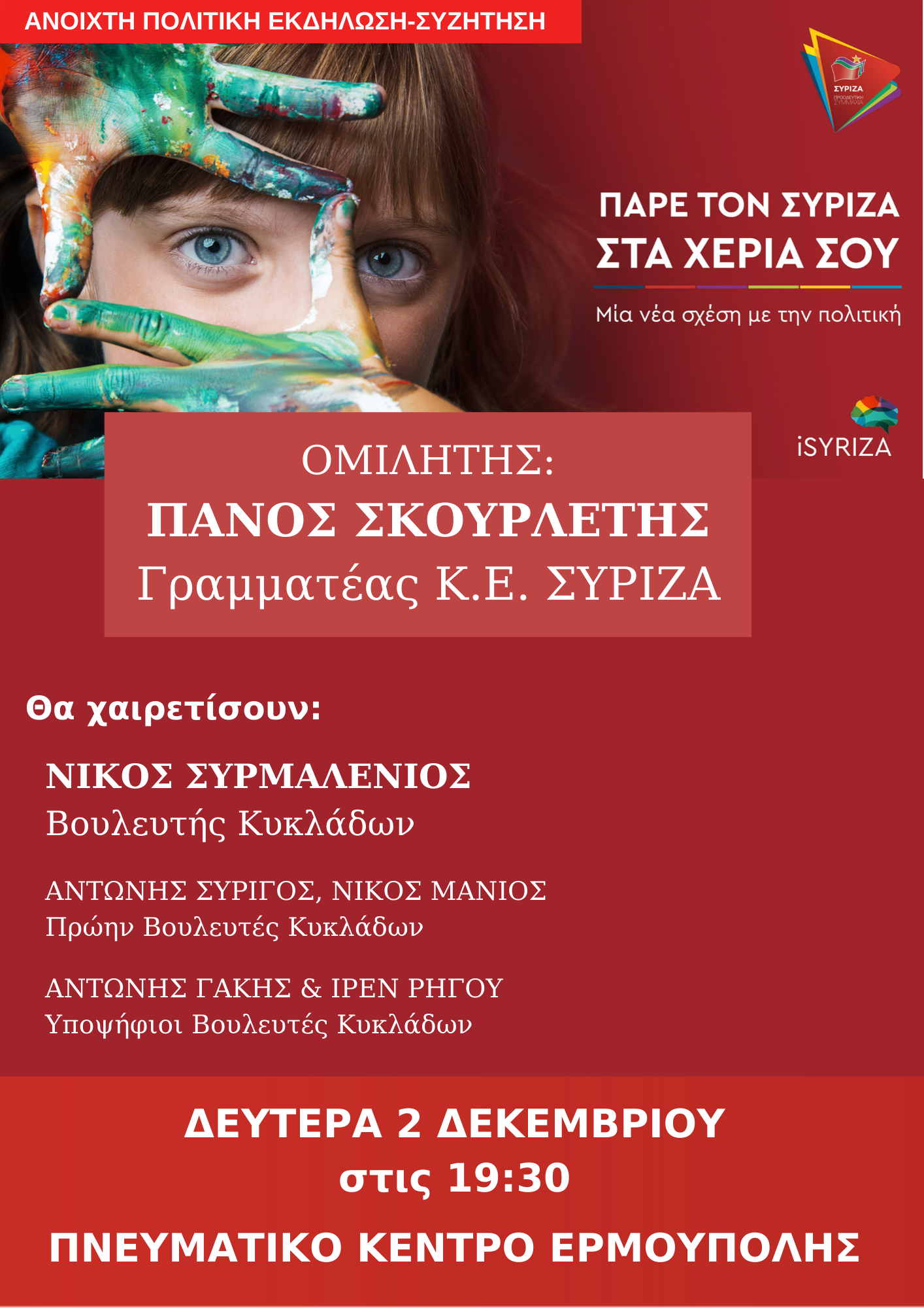Στο πλαίσιο της μεγάλης εξόρμησης που πραγματοποιεί ο ΣΥΡΙΖΑ με ορίζοντα το 3ο Συνέδριο και σύνθημα «Πάρε Τον ΣΥΡΙΖΑ Στα Χέρια Σου», η Οργάνωση Μελών Σύρου και η Νομαρχιακή Επιτροπή ΣΥΡΙΖΑ Κυκλάδων πραγματοποιούν