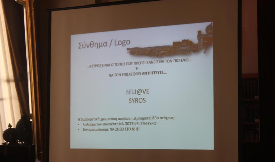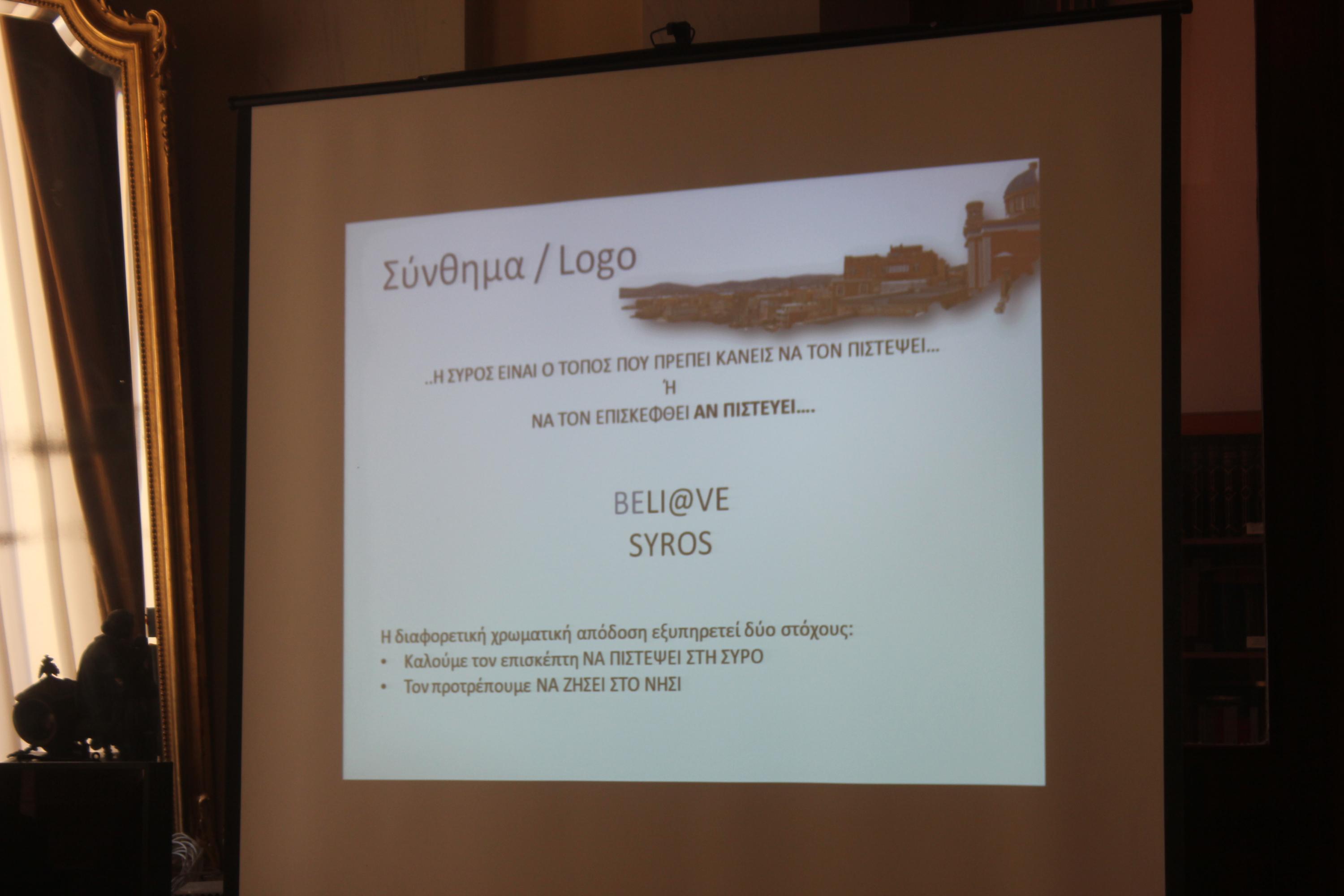 Στις προτάσεις που κατέθεσε προς τον Δήμο, ο κ. Μαρτάκης κρίνει επιβεβλημένη και την αλλαγή του logo. Ειδικότερα, επισημαίνει πως το σημερινό logo “Moore than an island” πρέπει να διατηρηθεί ως επεξηγηματικό, ενώ σύμφωνα με το σκεπτικό που ανέλυσε, η Σύρος μπορεί να αποκτήσει το BELI@VE SYROS. Πιο αναλυτικά στην παρουσίασή του είπε τα εξής: “Περιγραφή του σκεπτικού: Με στόχο την ανάδειξη της Σύρου ως τόπου, που συνδυάζει το απόλυτα εναρμονισμένο θρησκευτικό στοιχείο, που αποτελεί τόπο, όχι μόνο διακοπών, αλλά ακόμα και διαμονής και που διαθέτει πληθώρα ενδιαφερόντων που καλύπτουν όλο το φάσμα των αναζητήσεων κάθε επισκέπτη” και με άξονα τη δημιουργία του κινήτρου της περιέργειας (αναφορικά με τα όσα ο προορισμός διαθέτει) και της πίστης (σε όσα υπόσχεται στον υποψήφιο επισκέπτη), το νησί πρέπει να δώσει έμφαση στα ποιοτικά χαρακτηριστικά του και στα στοιχεία της ασφάλειας και της φιλικότητας. Για όλα τα παραπάνω, ο ίδιος επανέλαβε την πρότασή του για το logo: BELI@VE SYROS.