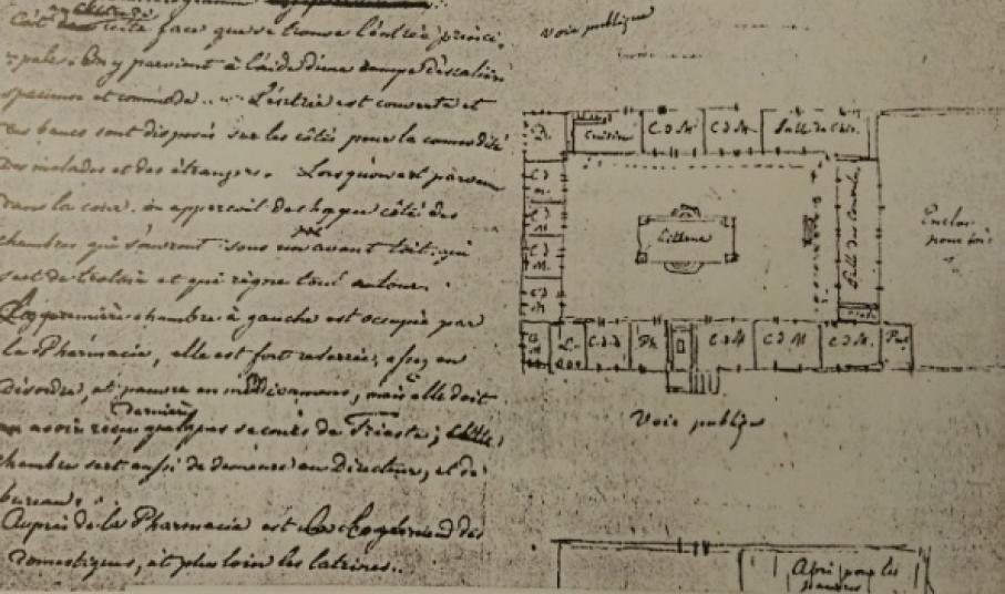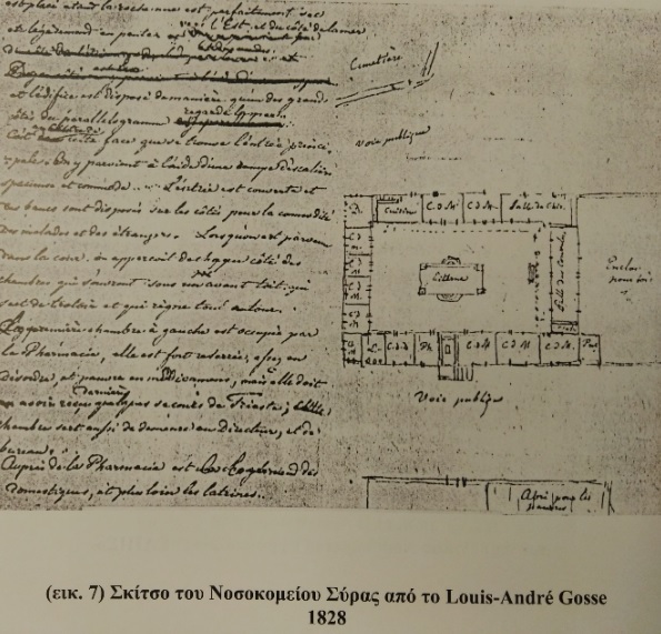 Η τάξη των εμπόρων χρηματοδοτεί την οικοδόμηση δημόσιων κτηρίων, αρχής γενομένης με την ανέγερση Νοσοκομείου το 1825, με τη δομή νοσηλευτικού ιδρύματος. Αυτό αντικατέστησε το υποτυπώδες υπάρχον, που είχε ξεκινήσει ως αναρρωτήριο από το 1821, περιθάλποντας και τους καταδιωκόμενους από την Επαναστατημένη Ελλάδα. (...) Το Νοσοκομείο της Ερμούπολης συστάθηκε λόγω των συνεχώς αυξημένων αναγκών τόσο των εποίκων, όσο και των προσερχομένων σε αυτήν τραυματιών της Επανάστασης. (...)”.