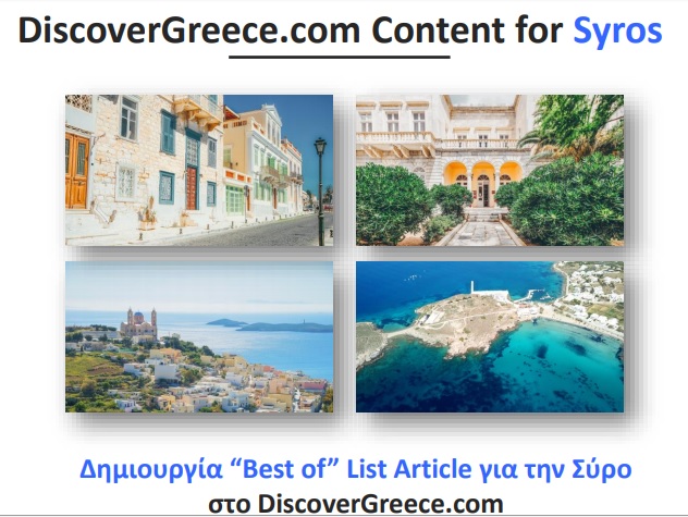 “Best of” List Article on DiscoverGreece: Δημιουργία νέου “Best of” List Article στο DiscoverGreece.com για τη Σύρο σε 7 γλώσσες, το οποίο λειτουργεί ως bucket list για όσα προτείνουμε στον επισκέπτη να ζήσει στον προορισμό. Παρουσίαση highlighted χαρακτηριστικών του τουριστικού προϊόντος, με compact πληροφορία και σκοπό να εμπνεύσει τον δυνητικό επισκέπτη και να του αναδείξει τα must-do experiences του προορισμού. Ενδεικτικό “Best of” List Article στο DiscoverGreece.com: 12 popular sailing destinations in the Aegean.