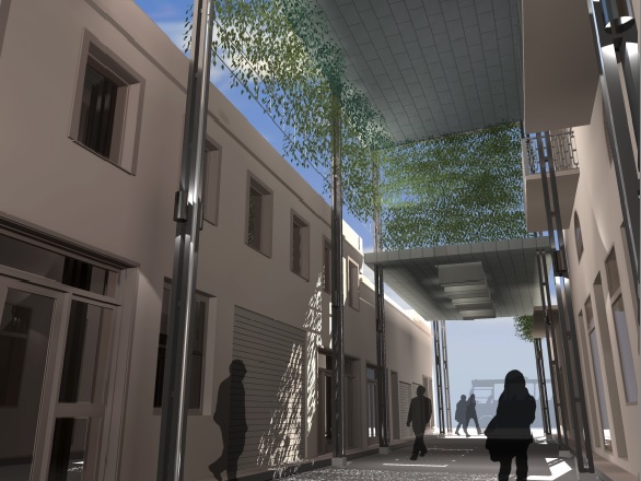 α. Το στέγαστρο θα αποτελείται από 14 επίπεδα στέγαστρα τα οποία τοποθετούνται σε διάφορα ύψη και επίπεδα κατά μήκος της οδού, προσαρμοζόμενα κάθε φορά στις απαιτήσεις των όψεων των κτιρίων. β. Στηρίζεται σε απλές διατομές μορφοσιδήρου UPN μικρής διατομής. γ. Η κατασκευή είναι αυτοφερόμενη και σε κανένα σημείο δεν ακουμπά στα κτίρια. δ. Καλύπτεται στην οροφή και το περιθώριό του με φύλλα τιτανιούχου ψευδαργύρου (διακριτική και εξευγενισμένη υπόμνηση των τσίγκινων επίτοιχων στεγάστρων). ε. Στα 4 χαμηλότερα τμήματα του στεγάστρου προβλέπεται επιμήκης παραλληλόγραμμος φεγγίτης για τον επαρκή φωτισμό της οδού, ο οποίος σκιάζεται από μεγάλες κατακόρυφες περσίδες. στ. Σε διάφορα σημεία προβλέπεται αναρτημένη φύτευση, η οποία φιλτράρει το φως δημιουργώντας δροσερή ατμόσφαιρα και ανάλαφρο φωτισμό, ενώ ταυτόχρονα προσθέτει μικροκλίμα πρασίνου στην περιοχή. ζ. Στο βόρειο άκρο επί της οδού Χίου και πλ. Μιαούλη το πρώτο στέγαστρο είναι μια περσιδωτή κατασκευή, η οποία έχει σαν στόχο να σηματοδοτήσει την αρχή του στεγάστρου και να δημιουργήσει μια περιοχή μερικής σκίασης στην αρχή της αγοράς , για την ομαλή οπτική μετάβαση από το φως στη σκιά. η. Στην οδό Πρωίου το στέγαστρο διακόπτεται. Τα δύο τμήματα του στεγάστρου συναντιόνται και σε κάποιο ύψος το ένα προσεγγίζει το άλλο, χωρίς όμως να το φτάνει εντελώς. θ. Τέλος, στα υψηλότερα στέγαστρα που έχουν επαρκή ηλιασμό προβλέπονται φωτοβολταϊκά πάνελ για τον φωτισμό του ίδιου του στεγάστρου και όχι μόνο.