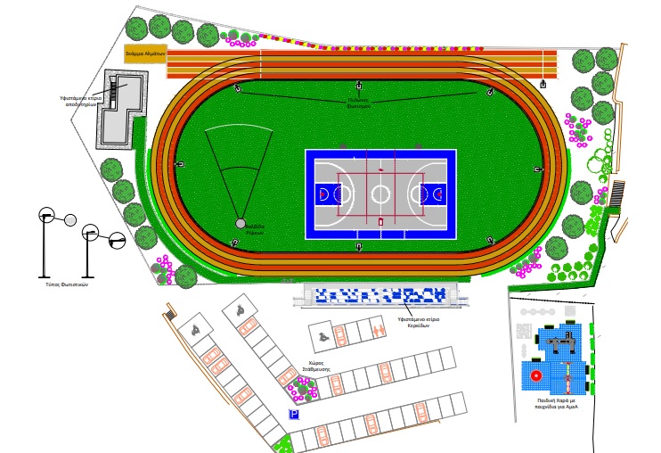 Σύμφωνα με την τεχνική μελέτη το Αθλητικό Κέντρο θα περιλαμβάνει τα εξής: 1. Στίβο 200μ με τέσσερα κουλουάρ κατασκευασμένα με υλικό τελευταίας τεχνολογίας. 2. Σκάμμα για τη διεξαγωγή των αθλημάτων μήκους και τριπλούν. 3. Σκάμμα για τη διεξαγωγή των αθλημάτων ύψους και άλματος επί κοντώ. 4. Βαλβίδα ρίψεων. 5. Ευθεία με 5 κουλουάρ για τη διεξαγωγή του αγωνίσματος των 60μ ταχύτητος με προοπτική επέκτασής του για τη διεξαγωγή του αγωνίσματος των 100μ. 6. Γήπεδο μπάσκετ - βόλεϊ – τένις. 7. Εννέα πυλώνες ηλεκτροφωτισμού του σταδίου με φωτισμό LED. 8. Συνθετικό χλοοτάπητα για την κάλυψη όλου του σταδίου.