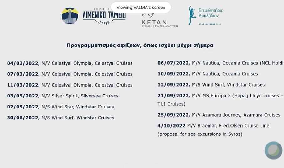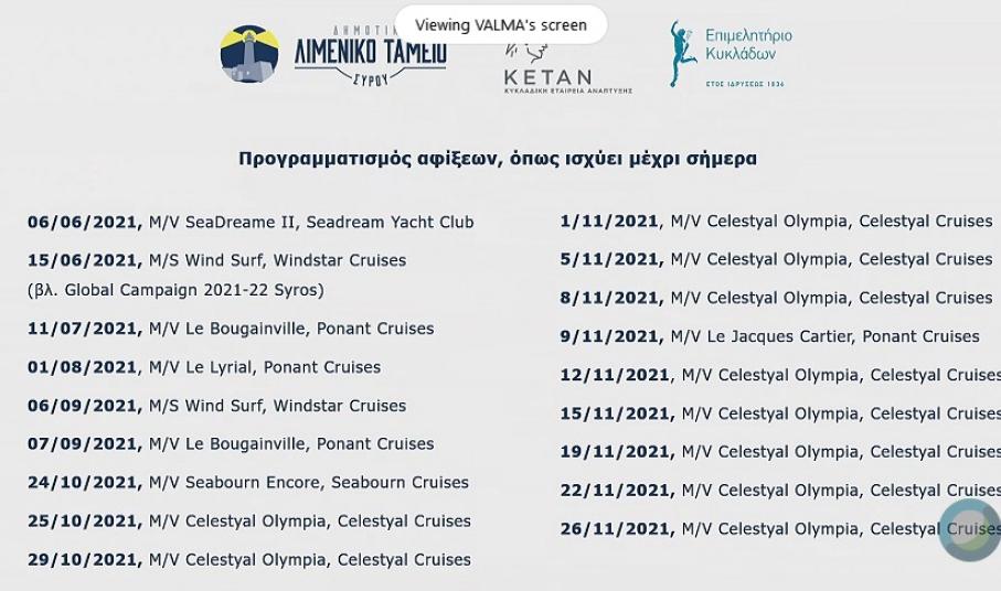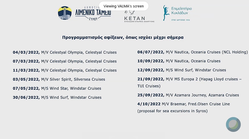 Ιδιαιτέρως σημαντική υπήρξε η τοποθέτηση της Διευθύντριας για την Ανατολική Μεσόγειο της Διεθνούς Ένωσης Κρουαζιέρας (CLIA), Μαρίας Δεληγιάννη στην τηλεδιάσκεψη του Λιμενικού Ταμείου και του Επιμελητηρίου με τους φορείς της Σύρου και τους επαγγελματίες τουρισμού.