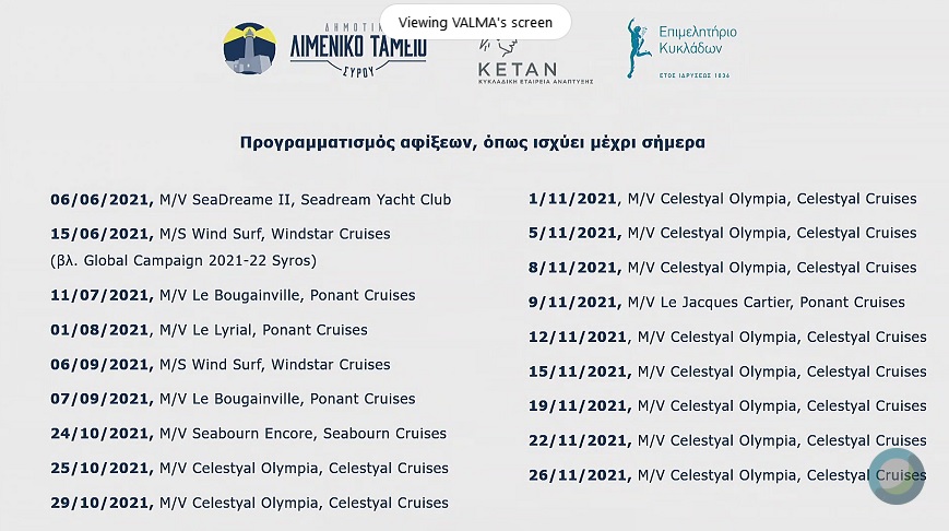 Αποφασισμένη να δείξει ετοιμότητα για την υποδοχή της κρουαζιέρας το 2021 παρουσιάζεται η Σύρος, με το σύνολο των εμπλεκομένων μερών με τον θαλάσσιο τουρισμό, να συντονίζεται και να συνεργάζεται, προκειμένου να δεχθεί τις ήδη προγραμματισμένες αφίξεις για το λιμάνι της Ερμούπολης, τηρώντας στο ακέραιο τα υγειονομικά πρωτόκολλα, δεδομένης της πανδημίας.