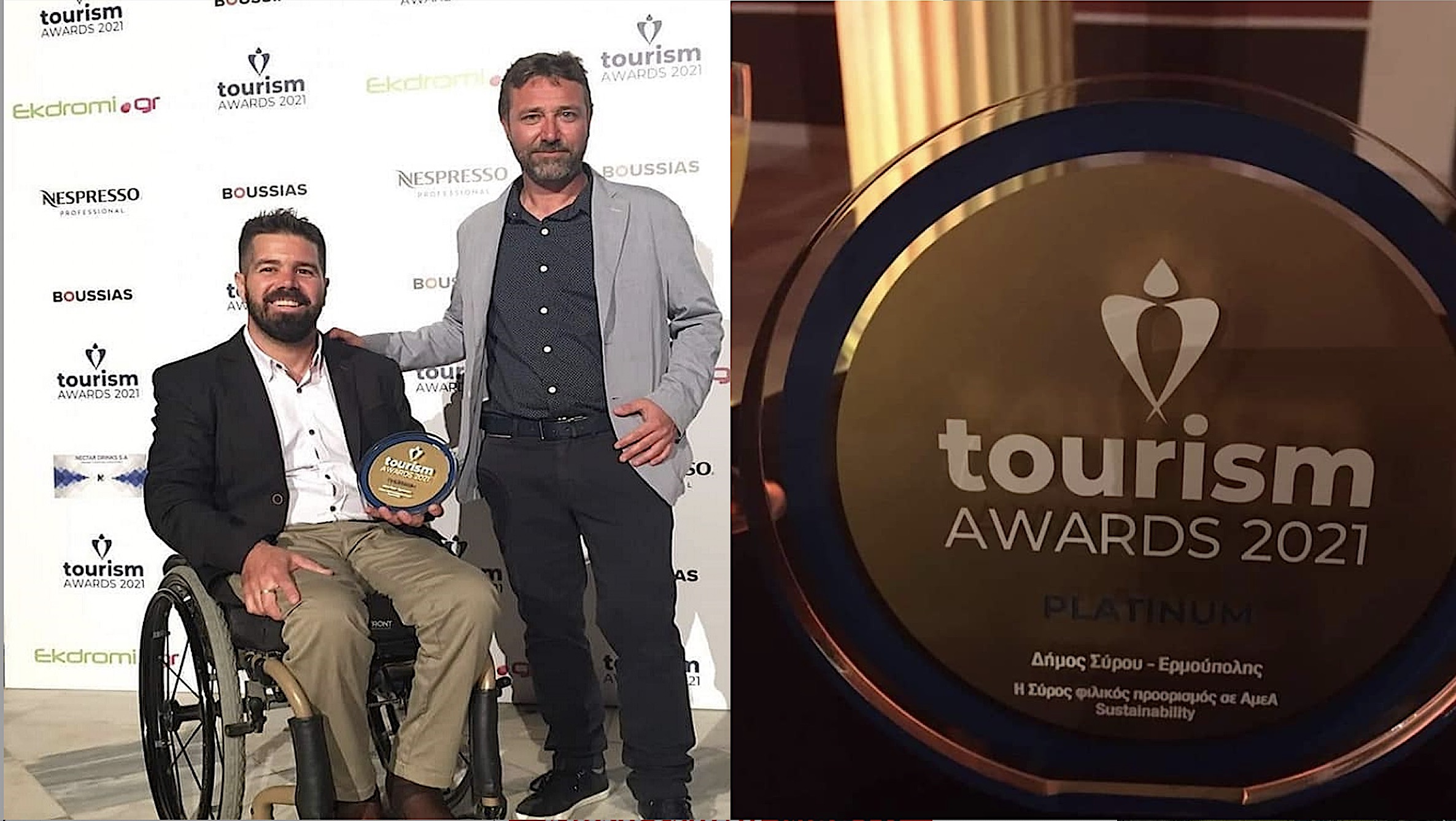 Η πρόοδος της Σύρου σε επίπεδο βελτίωσης και ανάπτυξης υποδομών για την εξυπηρέτηση και φιλοξενία των ΑΜΕΑ τιμήθηκε στη φετινή διοργάνωση των Tourism Awards 2021, με τον συμπολίτη μας, Νίκο Ρούσσο και τον Αντιδήμαρχο, Παναγιώτη Κουταβά να παραλαμβάνουν το platinum βραβείο για την πρωτεύουσα των Κυκλάδων, στην κατηγορία της προσβασιμότητας.
