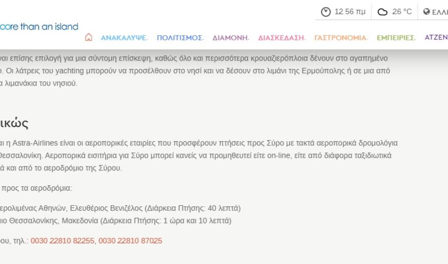 Δυστυχώς, τα τελευταία έξι χρόνια, το εν λόγω portal περιλαμβάνει ελλιπή στοιχεία για το νησί, καθώς επίσης λανθασμένες αναφορές, αλλά ακόμη και μη ορθές πληροφορίες για τη σύνδεση της Σύρου, με κραυγαλέο παράδειγμα τη σημείωση πως η Σύρος διαθέτει αεροπορική σύνδεση με Θεσσαλονίκη.