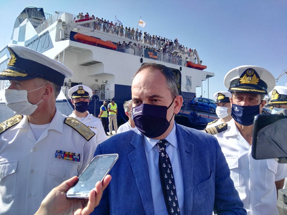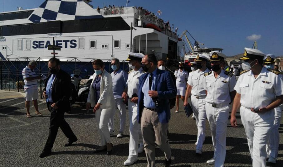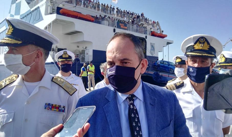Στις σύντομες δηλώσεις του στο λιμάνι, ο Υπουργός τόνισε πως η επίσκεψή του στο νησί πραγματοποιείται στο πλαίσιο επίβλεψης των αυστηρότατων ελέγχων, για την τήρηση των προβλεπόμενων μέτρων και τα απαραίτητα δικαιολογητικά, που πραγματοποιούνται κατά την επιβίβαση και αποβίβαση των επιβατών στα πλοία.