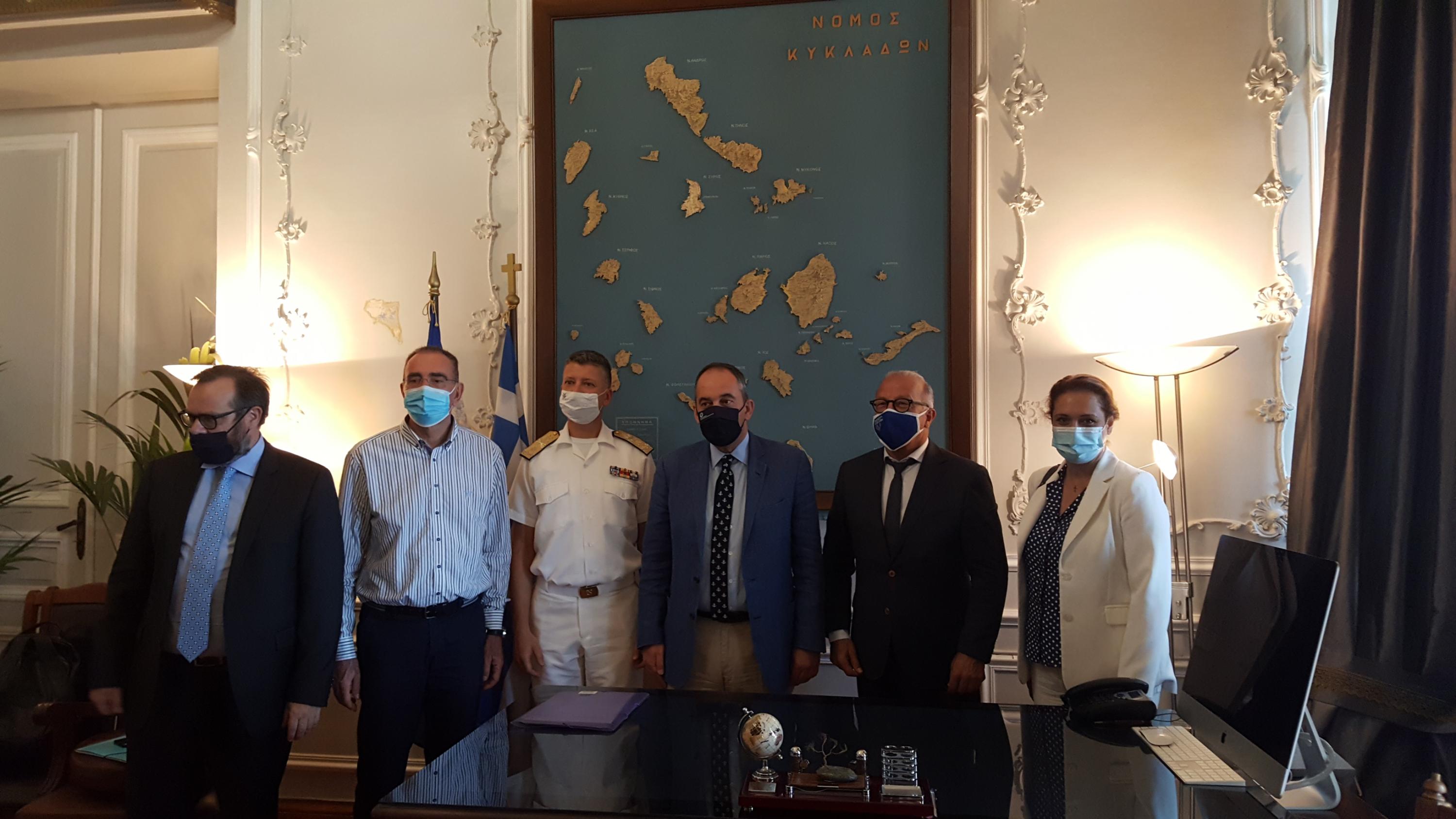 Στο πλαίσιο της προγραμματισμένης επίσκεψης του Υπουργού Ναυτιλίας και Νησιωτικής Πολιτικής κ. Ιωάννη Πλακιωτάκη στη Σύρο, συνοδεία του Αρχηγού του Λιμενικού Σώματος – Ελληνικής Ακτοφυλακής Αντιναύαρχου Λ.Σ. Θεόδωρου Κλιάρη, της Γενικής Γραμματέα Τουριστικής Πολιτικής και Ανάπτυξης κας Βασιλικής Λοΐζου και του Γενικού Γραμματέα Λιμένων, Λιμενικής Πολιτικής και Ναυτιλιακών Επενδύσεων κ. Ευάγγελου Κυριαζόπουλου, πραγματοποιήθηκε συνάντηση στην Περιφέρεια Νοτίου Αιγαίου, παρουσία του Αντιπεριφερειάρχη Κυκλάδων κ. Γεώργιου Λεονταρίτη, του Δημάρχου Σύρου – Ερμούπολης κ. Νικόλαου Λειβαδάρα, της Προέδρου του Δημοτικού Λιμενικού Ταμείου Σύρου κας Κανδιώς Μαραγκού, του Λιμενάρχη Σύρου κ. Ιωάννη Βαμβακούση, του Διοικητή της 6ης Περιφερειακής Διοίκησης Λιμενικού Σώματος κ. Ιάκωβου Γκύζη και του Προέδρου του Επιμελητηρίου Κυκλάδων κ. Ιωάννη Ρούσσου.