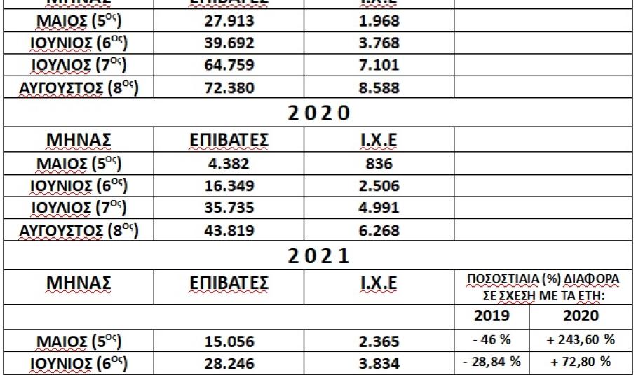Ενδιαφέρον παρουσιάζουν και στοιχεία των αφίξεων σχετικά με τα οχήματα που μετακινήθηκαν στη Σύρο κατά τον μήνα Αύγουστο. Συγκεκριμένα, το 2019 είχαμε 8.588 Ι.Χ. και το 2021 ήρθαν 9.567 Ι.Χ..