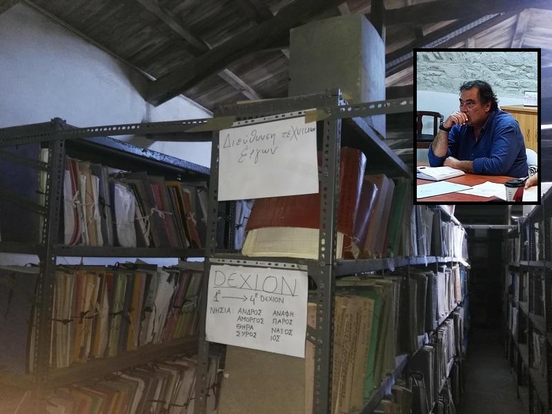 Με τη στάση του επιβεβαίωσε ουσιαστικά την κατάρρευση των ραφιών – βιβλιοθηκών που είναι τοποθετημένα τα αρχεία τεσσάρων νησιών των Κυκλάδων, εξαιτίας της έντονης βροχόπτωσης και των θυελλωδών ανέμων που επικράτησαν προ ημερών στη Σύρο και που όπως είναι γνωστό, προκάλεσαν ζημιές στον χώρο και παρ΄ ολίγον καταστροφή ενός μέρους του αρχείου.