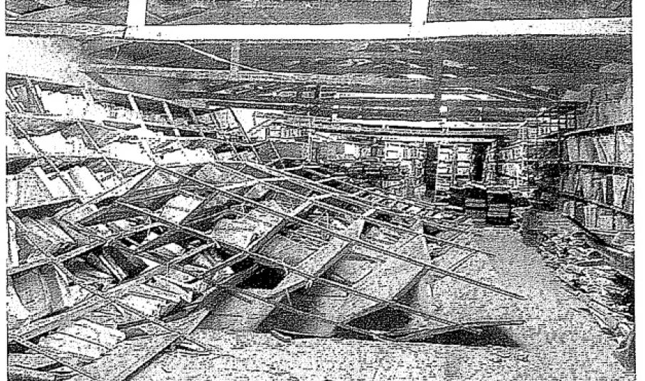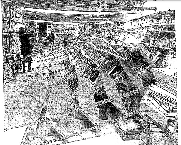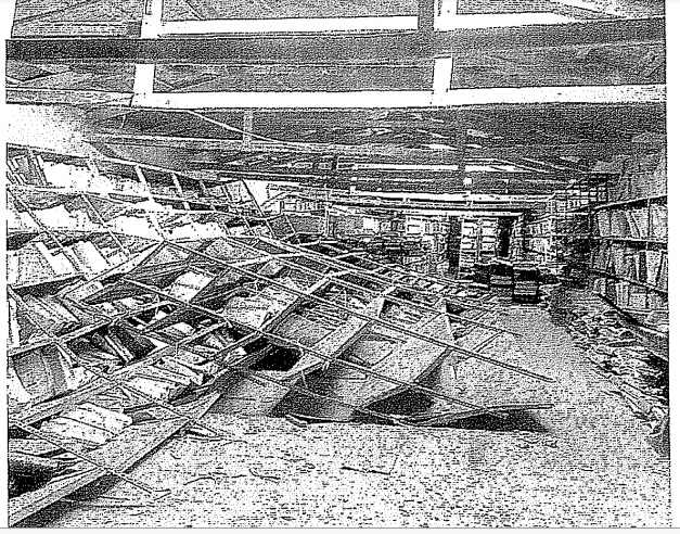 (...) Συγκεκριμένα διαπιστώθηκαν τα εξής: 1. Η στέγη του κτιρίου δεν διαθέτει την κατάλληλη μόνωση. 2. Κάποια από τα ζευκτά της στέγης έχουν υποστεί βλάβη στα σημεία αγκύρωσής τους με την τοιχοποιία καθώς και σε αρκετά σημεία των δοκών τους. 3. Λόγω των υφιστάμενων φθορών του κτιρίου σε συνδυασμό με τον μεγάλο όγκο των εισρεόντων υδάτων που προέκυψαν από την τήξη του χιονιού και του πάγου τις προηγούμενες ημέρες καθώς και των ισχυρών ανέμων που παρατηρήθηκαν στο ίδιο διάστημα, ένα από τα μεταλλικά ράφια (dexion) λύγισε, ανατράπηκε και συμπαρέσυρε τα υπόλοιπα που βρίσκονταν παράλληλα με αυτό.”.