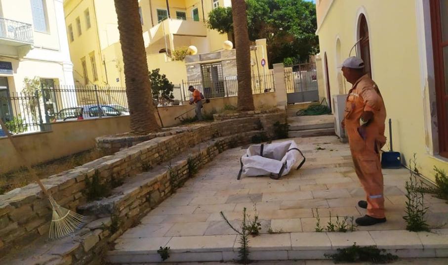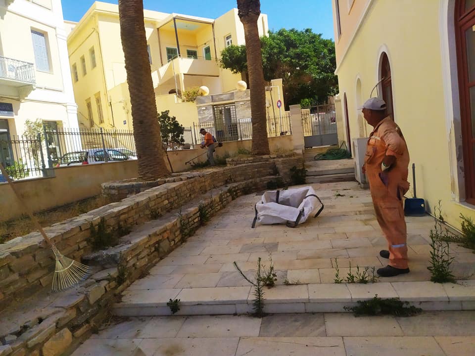 Σε εκτεταμένες εργασίες καθαριότητας, ευπρεπισμού και γενικότερου εξωραϊσμού, προχώρησε κλιμάκιο της Υπηρεσίας Καθαριότητας του Δήμου Σύρου – Ερμούπολης, στα κηπάρια όπισθεν του Δημαρχείου Σύρου και στα πλακόστρωτα σκαλιά που οδηγούν από την πλατεία στην πίσω πλευρά του εμβληματικού κτηρίου.