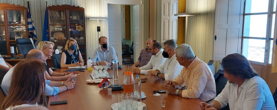 Συνάντηση εργασίας πραγματοποίησε σήμερα Τρίτη 16 Ιουλίου 2022 κυβερνητικό κλιμάκιο που επισκέφθηκε τη Σύρο με τον Πρόεδρο κ. Γιάννη Ρούσσο, τη Διοικητική Επιτροπή και Στελέχη του Επιμελητηρίου Κυκλάδων.