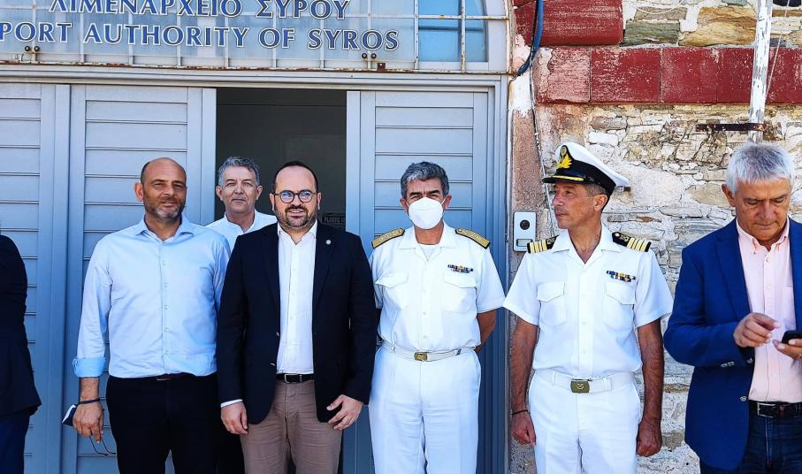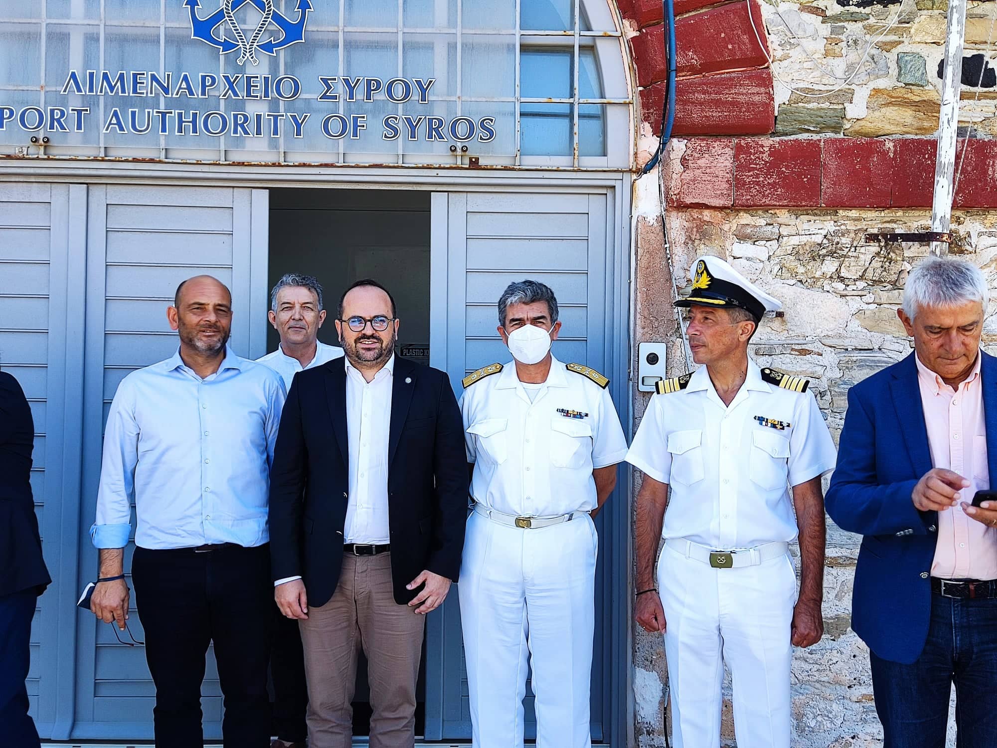 Αμέσως μετά, το κυβερνητικό κλιμάκιο μετέβη στους χώρους του Λιμεναρχείου Σύρου. Τον Γενικό Γραμματέα Αιγαίου και Νησιωτικής Πολιτικής υποδέχθηκε ο Λιμενάρχης Σύρου, Γιάννης Βαμβακούσης, ο οποίος πλαισιωνόταν από λιμενικούς καθώς και από τον Διοικητή της 6ης ΠΕΔΙΛΣ, Ιάκωβο Γκύζη.