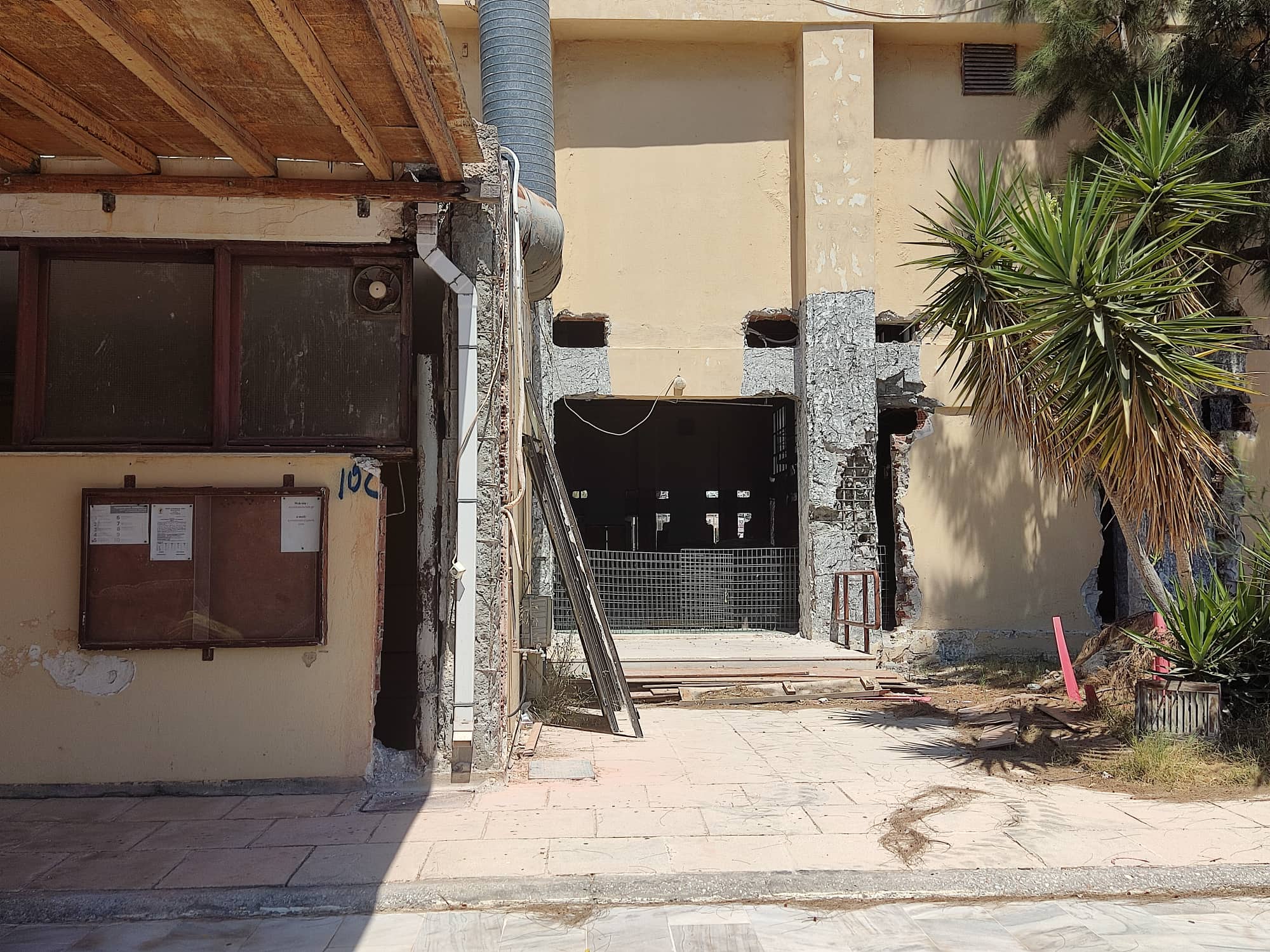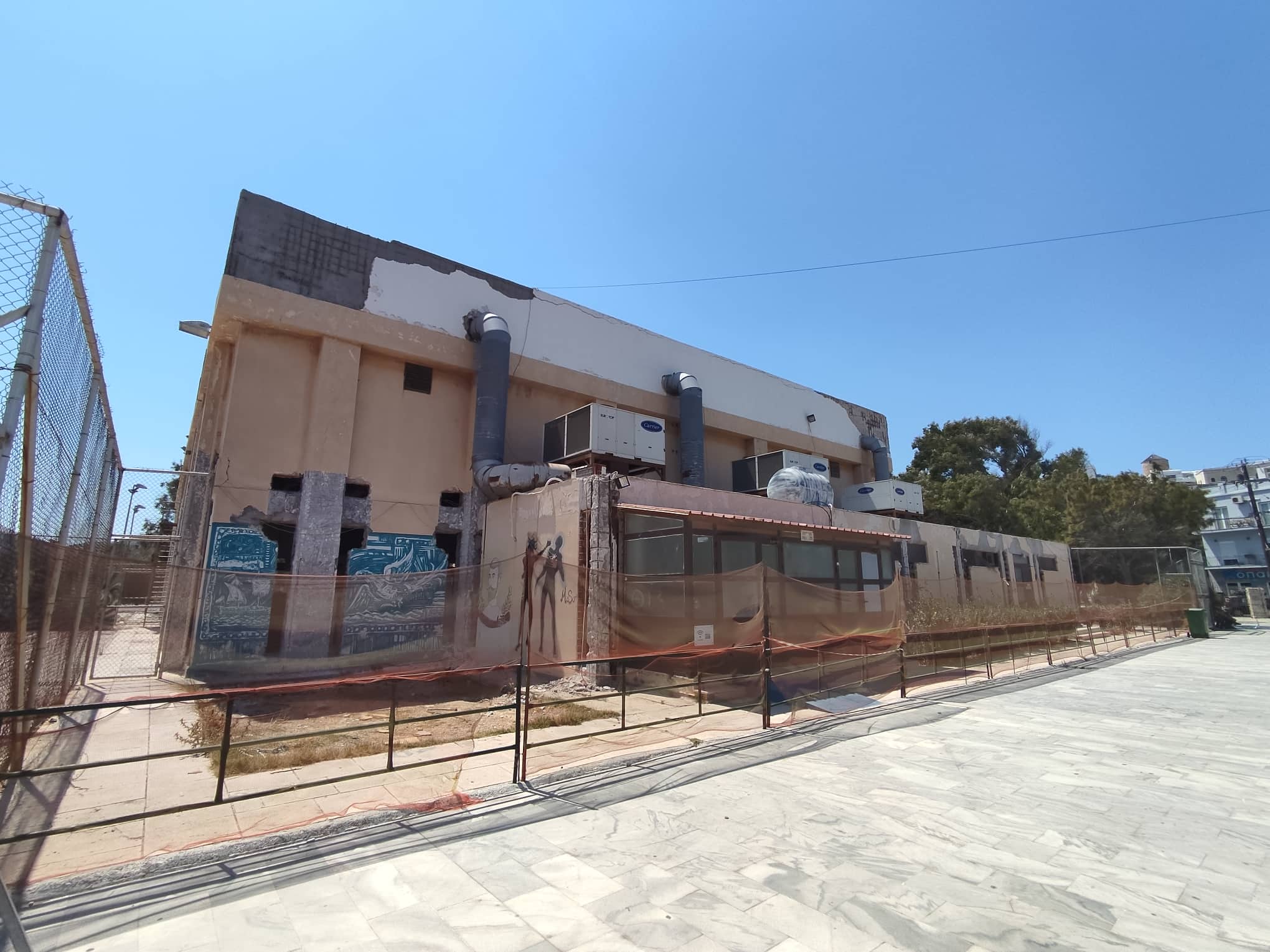 Παράλληλα, η Α΄ Κλειστή Αίθουσα παραμένει κουφάρι, αφού έχουν αναπτυχθεί εργασίες για την ενίσχυση του φέροντα οργανισμού, ωστόσο, σύμφωνα με τις απαντήσεις του Αντιδημάρχου Τεχνικών Υπηρεσιών, Μηνά Αληφραγκή, ο εργολάβος δεν προχωρά τις εναπομείνασες εργασίες σήμερα, με αποτέλεσμα η Υπηρεσία να βλέπει στην κατεύθυνση της εφαρμογής ποινικών ρητρών.