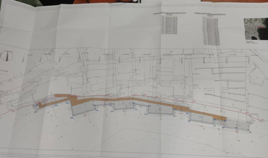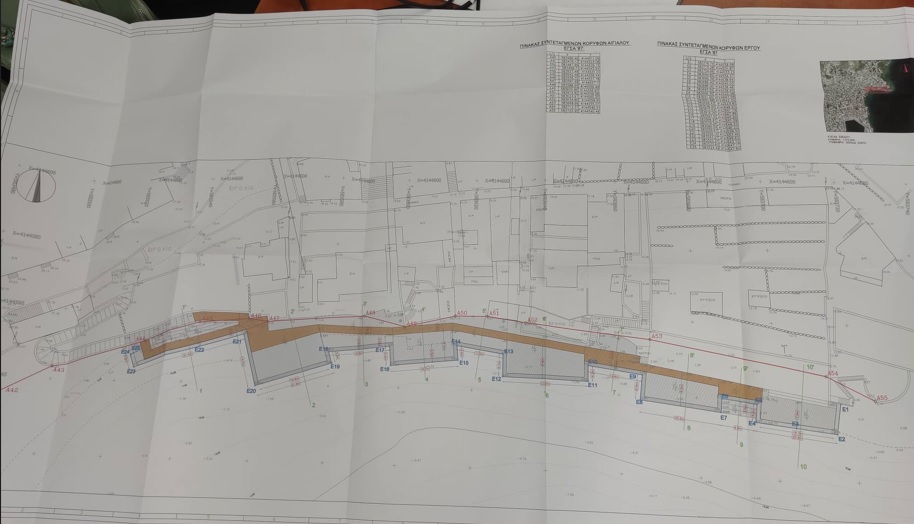 Βάσει των σχεδίων της μελέτης, “αρχικά προτείνεται η κατασκευή περιμετρικού τοιχίου εκ χύτου ύφαλου σκυροδέματος, επί του βραχώδους υπόβαθρου του πυθμένα. (...) Στη θέση των υφιστάμενων πλατωμάτων το εν λόγω τοιχίο θα κατασκευαστεί αμέσως μπροστά από αυτά προς την πλευρά της θάλασσας. Η άνω επιφάνεια του εν λόγω τοιχίου επεξεργάζεται ως τελική αντιολισθητική με τις κατάλληλες ρύσεις. (...)