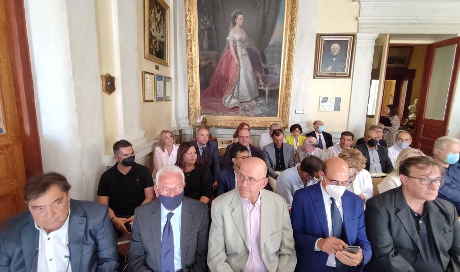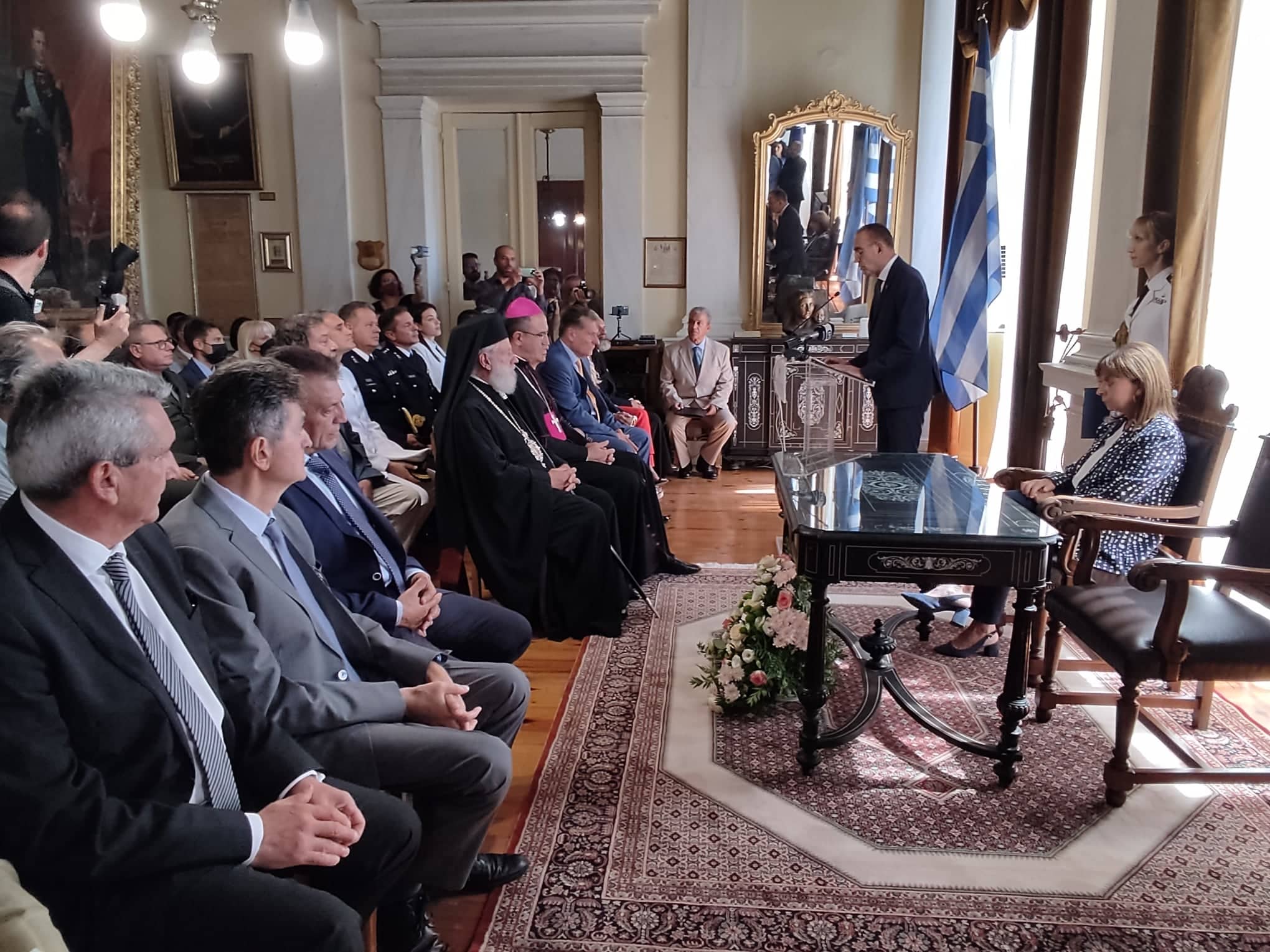 “Με ιδιαίτερη χαρά και ξεχωριστή τιμή υποδεχόμαστε σήμερα στο εμβληματικό Δημοτικό Μέγαρο του ιστορικού Δήμου Σύρου – Ερμούπολης την Αυτής Εξοχότητα Πρόεδρο της Δημοκρατίας, Κατερίνα Σακελλαροπούλου. Ειδικά τη φετινή χρονιά, κατά την οποία τιμούμε την επέτειο των 100 χρόνων από τη Μικρασιατική Καταστροφή, η παρουσία της Εξοχότατης Προέδρου λαμβάνει συμβολική σημασία δεδομένου ότι η Σύρος και η Ερμούπολη, η πόλη που γεννήθηκε από πρόσφυγες στις φλόγες της Επανάστασης του 1821 δέχθηκε το δεύτερο κύμα προσφύγων από τη Μικρά Ασία το 1922” ανέφερε προλογικά στην ομιλία του ο Δήμαρχος, Νίκος Λειβαδάρας, ευχαριστώντας την κα Σακελλαροπούλου για την αποδοχή της πρόσκλησης του Δήμου.