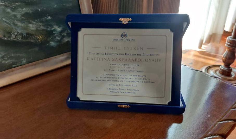 Την υπεύθυνη και ουσιαστική πορεία της στο ανώτατο πολιτειακό αξίωμα της χώρας ως σήμερα, αναγνωρίζουν οι δημότες της Σύρου στο πρόσωπο της Προέδρου της Δημοκρατίας, Κατερίνας Σακελλαροπούλου, την οποίαν και τίμησαν με την ανακήρυξή της σε επίτιμη δημότη του Δήμου Σύρου – Ερμούπολης.