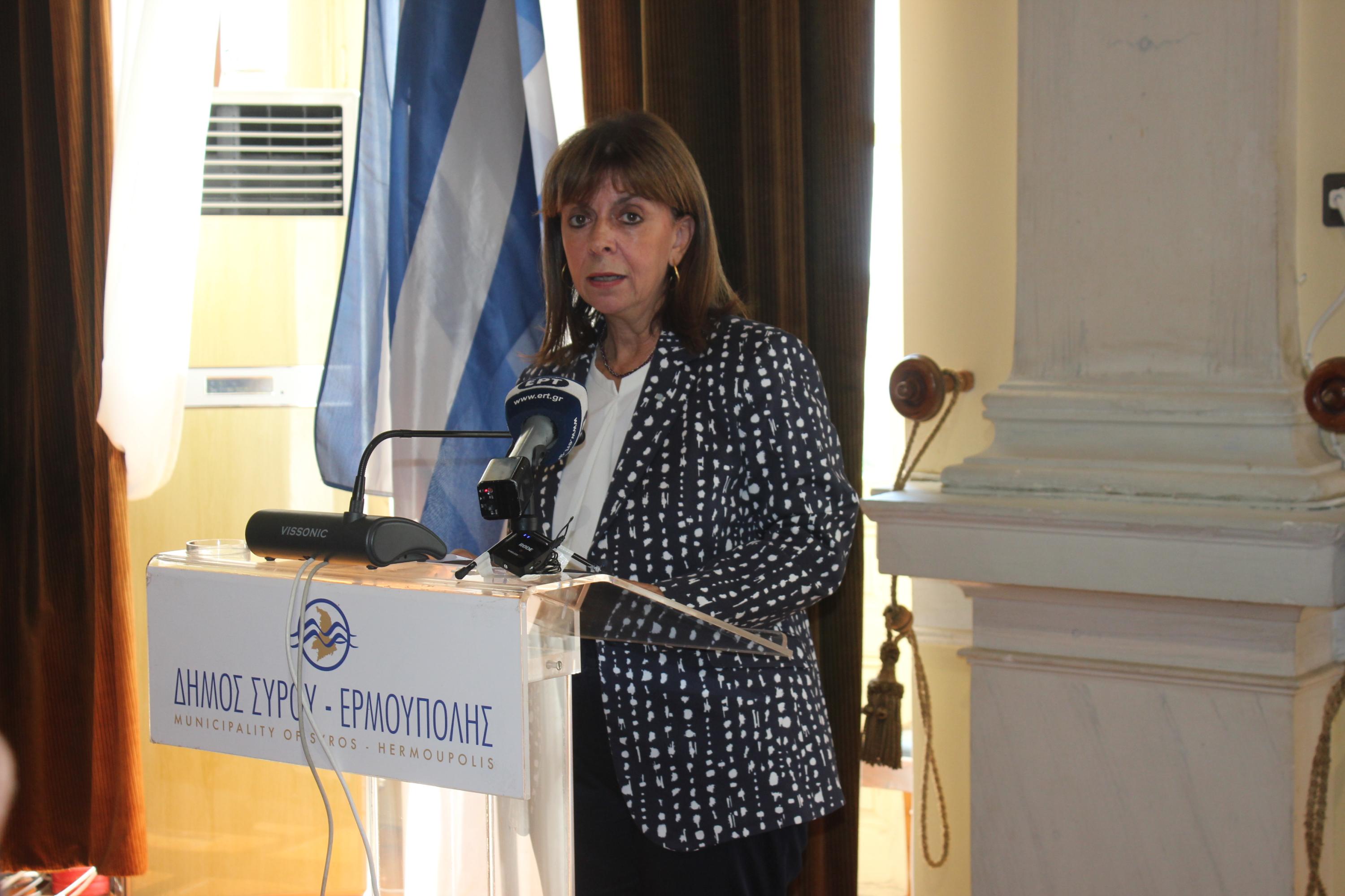 “Κυρία Πρόεδρε σας ευχαριστούμε θερμά που αποδεχόσαστε την πρόσκλησή μας να επισκεφθείτε τη Σύρο, την πρωτεύουσα των Κυκλάδων, την πρωτεύουσα του Νοτίου Αιγαίου προκειμένου να σας αναδείξουμε επίτιμη δημότη του Δήμου Σύρου – Ερμούπολης. Αποτελεί το ελάχιστο οφειλόμενο χρέος προς εσάς, ως την πρώτη γυναίκα που εξελέγη στο κορυφαίο πολιτειακό αξίωμα, αλλά και ως αναγνώριση του υψηλού σας φρονήματος και της πολυσχιδούς προσφοράς σας στη Δημοκρατία, τη Δικαιοσύνη, την Παιδεία και τον Πολιτισμό της χώρας μας”.