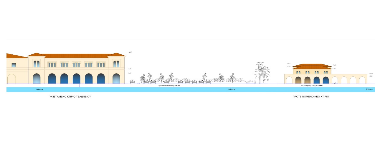 “Πίσω από το κρηπίδωμα, η τοποθέτηση του κτηρίου θα είναι 750 τ.μ. η συνολική κάλυψη και περιμετρικά του κτηρίου οι χώροι. (…) Στο εσωτερικό του κτηρίου, το συνολικό εμβαδό των κλειστών χώρων θα είναι 532 τ.μ. σε ισόγειο (450 τ.μ.) και οροφή, τα 300 τ.μ. θα είναι στεγασμένοι χώροι και το κτήριο στο ψηλότερο σημείο του θα είναι 7,5 μ. (συν 1,20 μ. η στέγη). Το ύψος του Τελωνείου είναι 11-12 μέτρα. Θα υπάρχουν ζώνες διακριτές για εισερχόμενους και εξερχόμενους επισκέπτες.