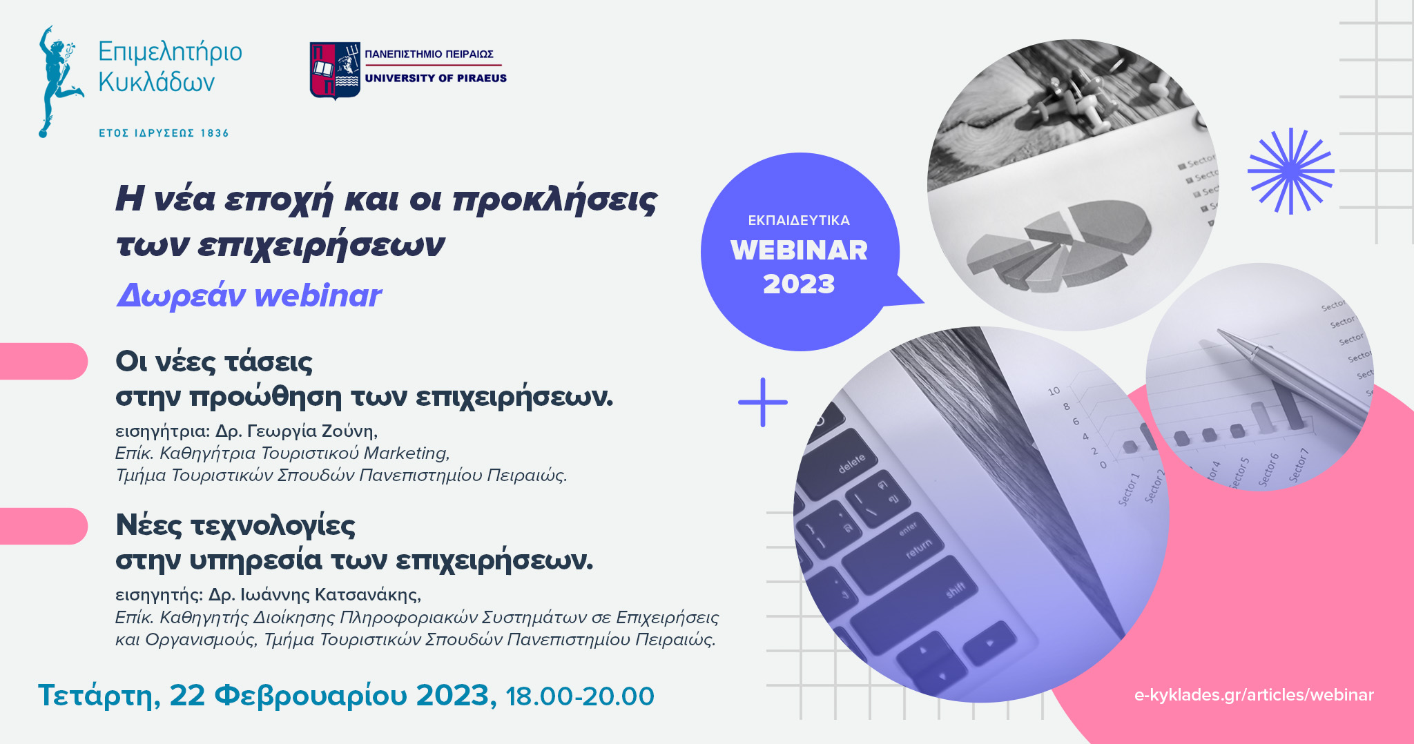 Σε αυτά και άλλα ερωτήματα γύρω από το θέμα “Η νέα εποχή και οι προκλήσεις των επιχειρήσεων”, θα απαντήσουν η Δρ. Γεωργία Ζούνη, Επίκουρη Καθηγήτρια Τουριστικού Μάρκετινγκ, Τμήμα Τουριστικών Σπουδών Πανεπιστημίου Πειραιώς, και ο Δρ. Ιωάννης Κατσανάκης, Επίκουρος Καθηγητής Διοίκησης Πληροφοριακών Συστημάτων σε Επιχειρήσεις και Οργανισμούς, Τμήμα Τουριστικών Σπουδών Πανεπιστημίου Πειραιώς, στο πλαίσιο της συνεργασίας του Επιμελητηρίου Κυκλάδων με το Πανεπιστήμιο Πειραιώς.