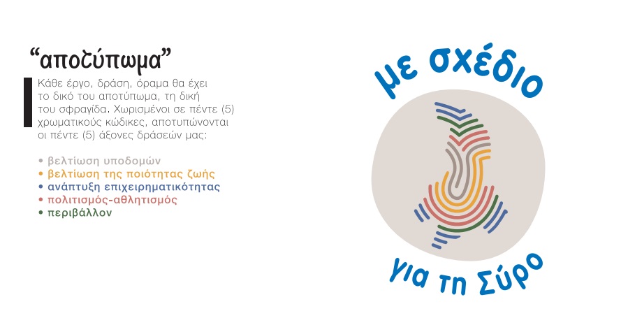 Ειδικότερα, για τη δημιουργία του λογοτύπου του συνδυασμού “Με σχέδιο για τη Σύρο”, ο επικεφαλής του, ανέπτυξε την κύρια συλλογιστική που ακολουθήθηκε. “Ως βασικό λογότυπο δημιουργήθηκε ένα αποτύπωμα στο σχήμα της Σύρου. Με απλό σχεδιασμό, ελεύθερη γραφή και γήινα χρώματα, το λογότυπό μας στοχεύει πρωτίστως να αντιπροσωπεύσει κάθε έναν πολίτη προσωπικά, με φιλικό και προσιτό τρόπο, θυμίζοντάς του, τη σημαντικότητά του ως προς τον τόπο του, καθώς και την προσωπική του σχέση με αυτόν, ενώ παράλληλα, προαναγγέλλει και το αποτύπωμα που θα αφήσουμε στη Σύρο, μέσα από το έργο μας. Το αποτύπωμα αυτό ανήκει σε όλους τους Συριανούς που αναζητούν τη θετική εξέλιξη του τόπου μας και συμμετέχουν ενεργά σε αυτό.”.