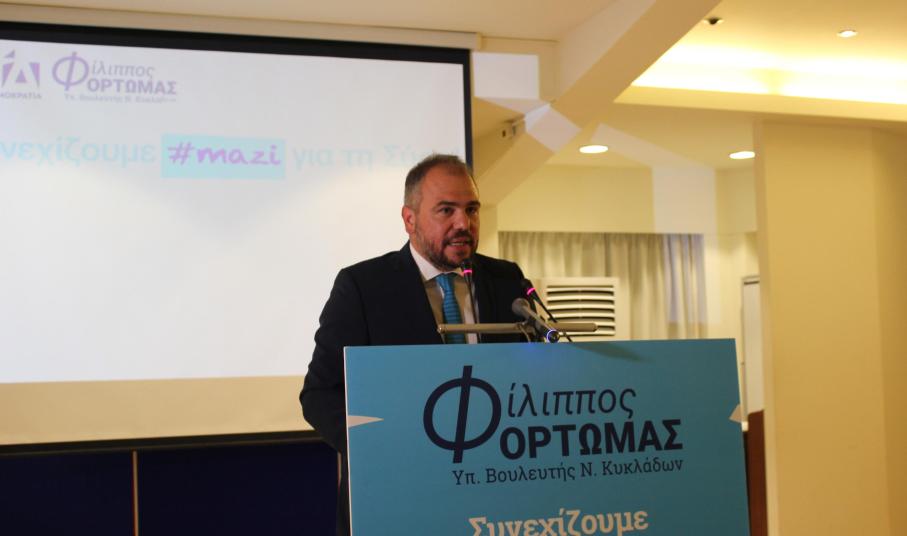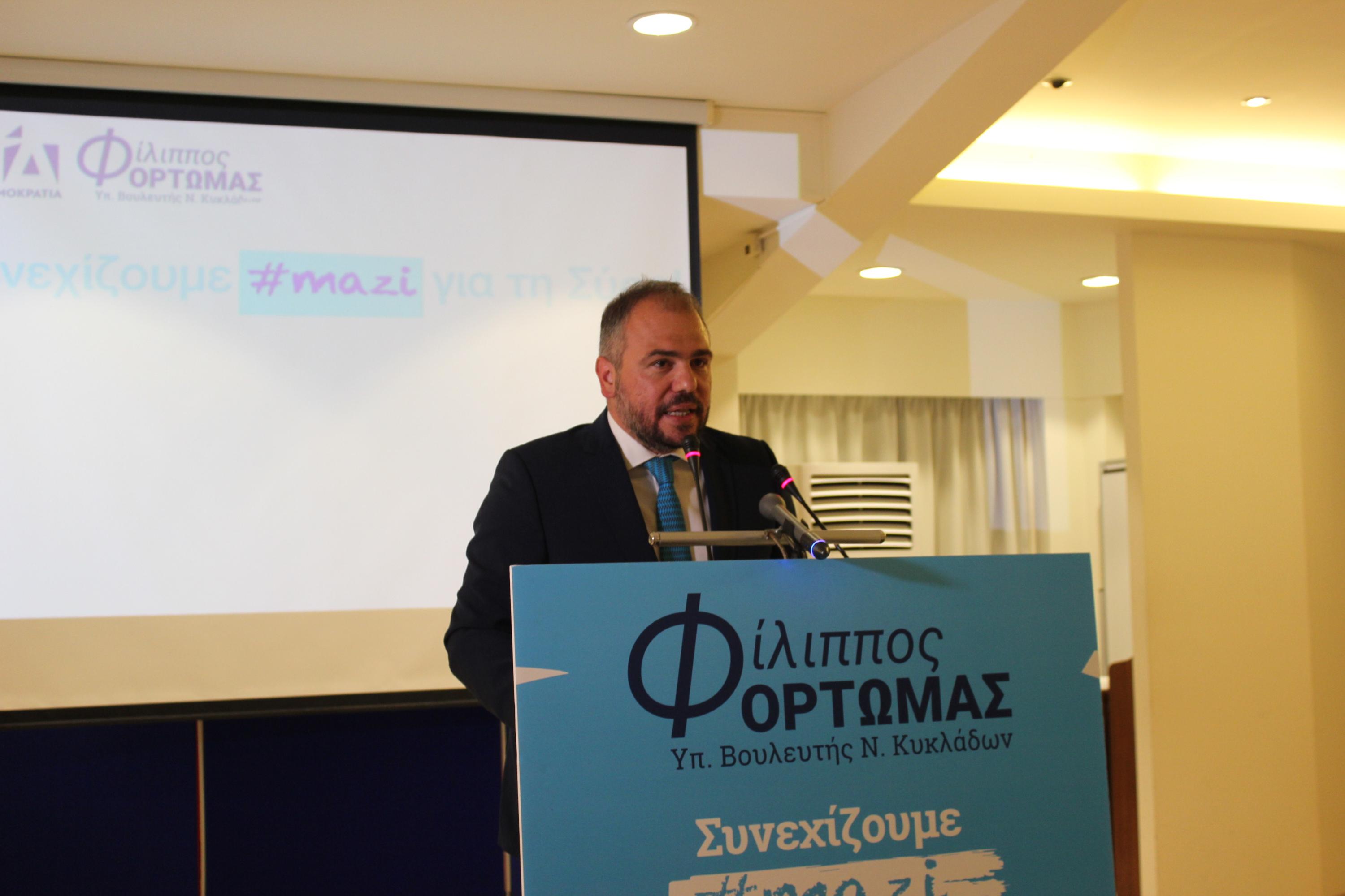 Ραντεβού με τους νησιώτες στην κάλπη της 21ης Μαΐου για μία αυτοδύναμη Νέα Δημοκρατία και μία ισχυρή Ελλάδα, έδωσε ο υποψήφιος βουλευτής Κυκλάδων της γαλάζιας παράταξης, Φίλιππος Φόρτωμας, στο πλαίσιο της προεκλογικής ομιλίας του στη Σύρο.