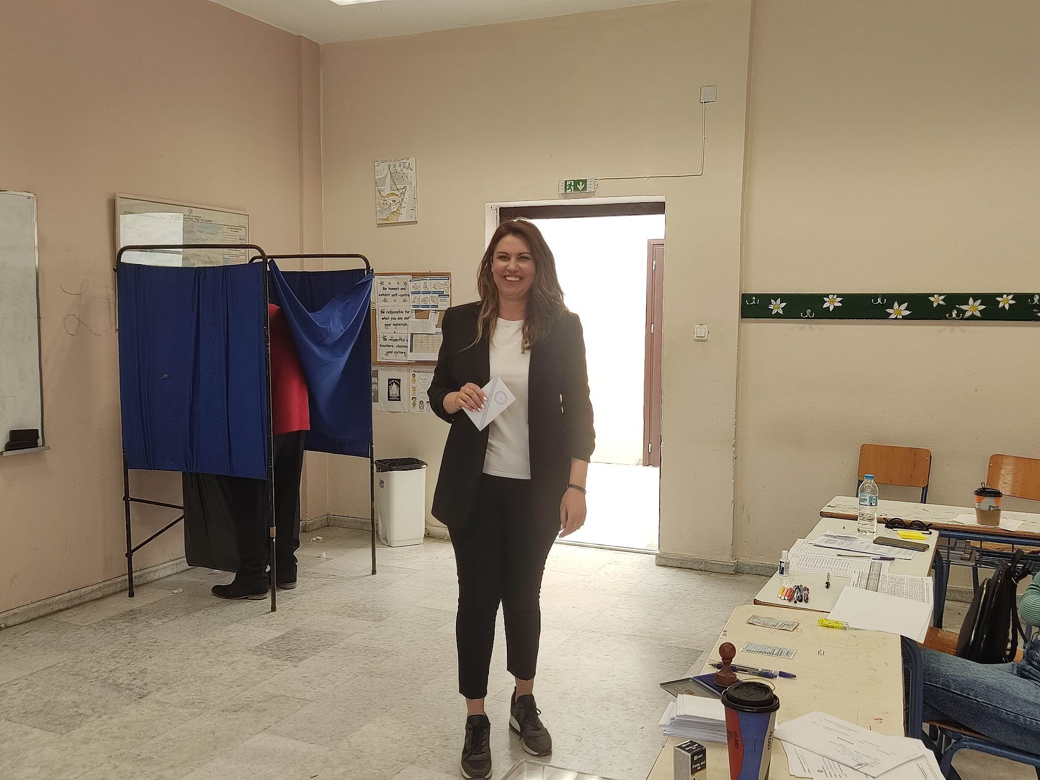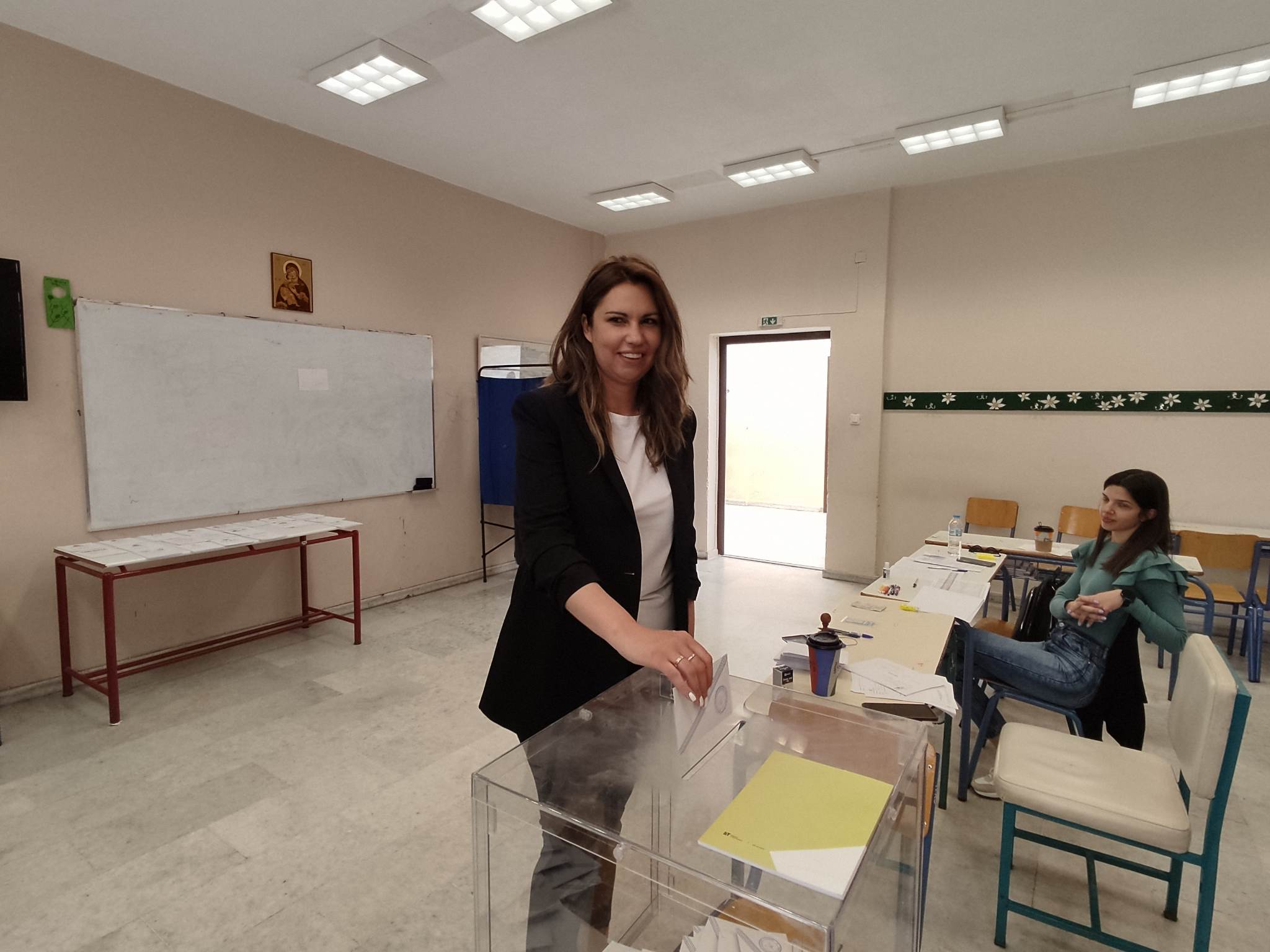 Συνοδευόμενη από τον πρόεδρο της ΔΕΕΠ Κυκλάδων της Ν.Δ., Χρήστο Καφτηράνη, τον πρόεδρο της τοπικής οργάνωσης της Νέας Δημοκρατίας στη Σύρο, Στάθη Μπαρμπούνη και άλλα κομματικά μέλη, η ίδια σε συνέχεια της περιοδείας που έκανε σε εκλογικά τμήματα του νησιού, έφτασε στο σχολικό συγκρότημα των Γυμνασίων και ψήφισε στο 255 εκλογικό τμήμα.