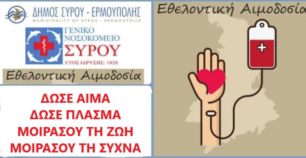Με αφορμή την Παγκόσμια Μέρα του Εθελοντή Αιμοδότη στις 14 Ιουνίου, ο Δήμος Σύρου-Ερμούπολης (Κοινωνική Υπηρεσία-Τοπικές Κοινότητες) και το Γενικό Νοσοκομείο Σύρου ”Βαρδάκειο και Πρώιο” (Τμήμα Αιμοδοσίας) διοργανώνουν προγραμματισμένη εθελοντική αιμοδοσία από τη Δευτέρα 12 έως και την Παρασκευή 16 Ιουνίου 2023, στον χώρο του Τμήματος Αιμοδοσίας του Γενικού Νοσοκομείου Σύρου.