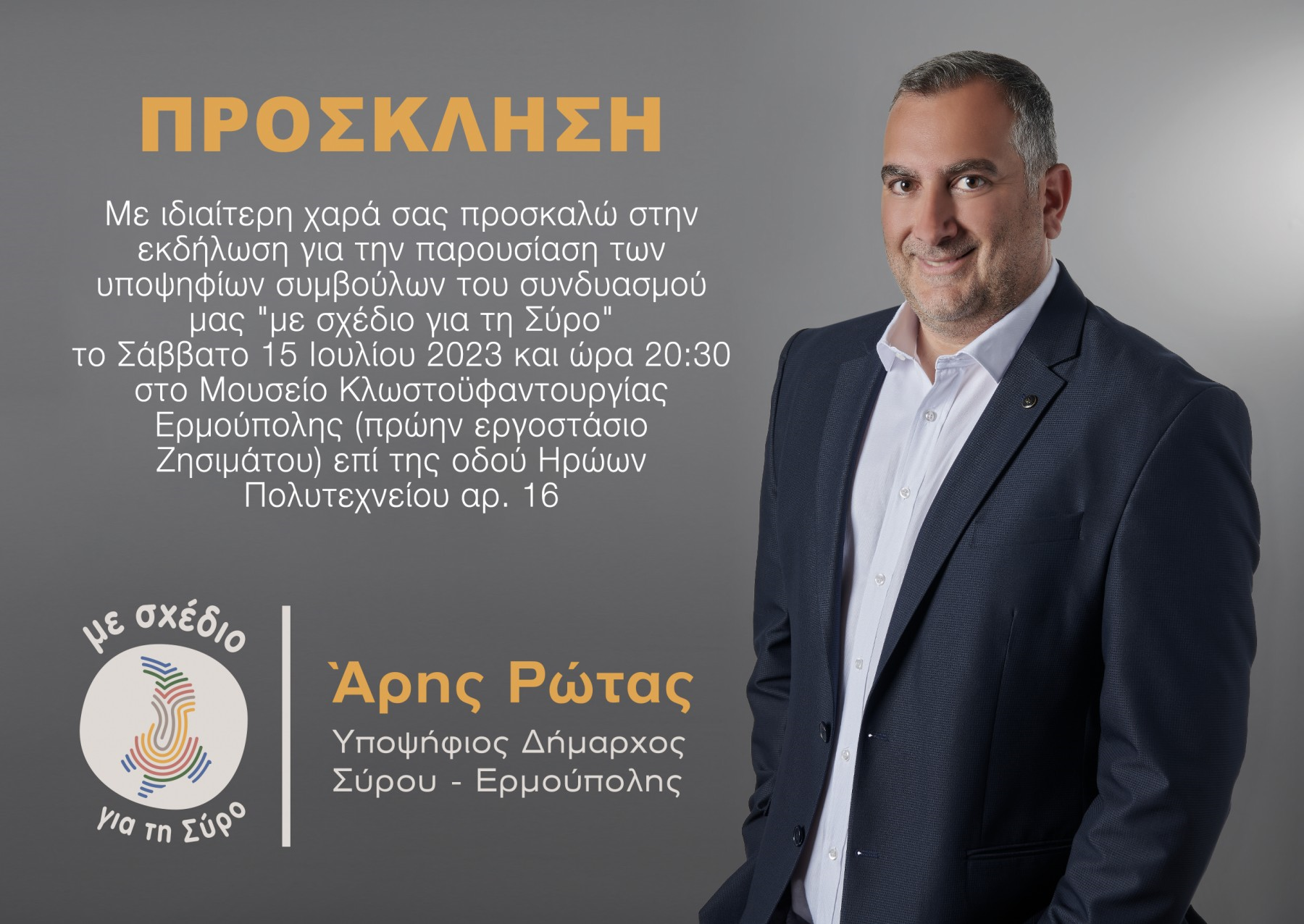 Εκδήλωση για την παρουσίαση των υποψηφίων συμβούλων του συνδυασμού "με σχέδιο για τη Σύρο" με υποψήφιο δήμαρχο Σύρου - Ερμούπολης, τον Άρη Ρώτα, το Σάββατο 15 Ιουλίου 2023 και ώρα 20:30