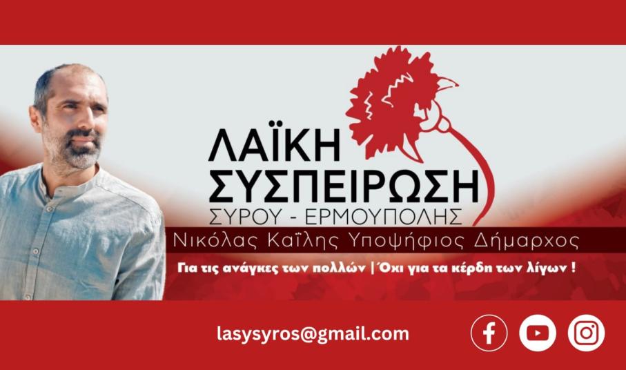 Πιστός στην κατεύθυνση της διεκδίκησης λύσεων για την καθημερινότητα των Συριανών παραμένει ο επικεφαλής της Λαϊκής Συσπείρωσης Σύρου – Ερμούπολης, Νικόλας Καΐλης, ο οποίος θέτει εκ νέου υποψηφιότητα ως δήμαρχος για τρίτη θητεία.