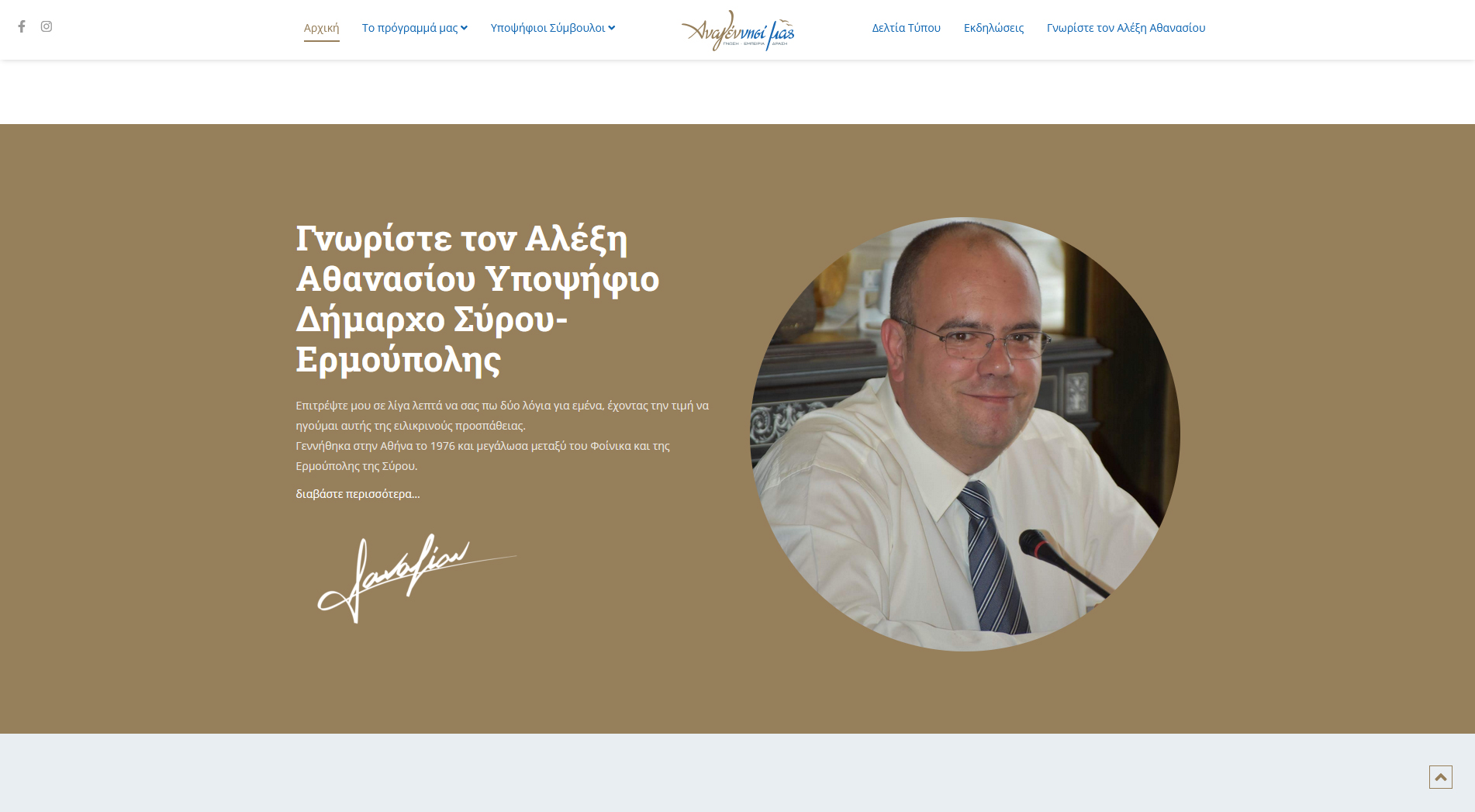 Με ένα δυναμικό Website, το περιεχόμενο του οποίου θα εμπλουτίζεται διαρκώς και Social Media με πρόθεση και στόχο να έχουν διαδραστικό ρόλο και αλληλεπίδραση με την Κοινωνία μας, επισήμως από σήμερα, Τετάρτη, 13 Σεπτεμβρίου 2023, κάνει αισθητή την παρουσία του στο περιβάλλον των ηλεκτρονικών Μέσων Επικοινωνίας, ο Δημοτικός Συνδυασμός “Αναγέννησί μας”, με επικεφαλής τον υποψήφιο Δήμαρχο Σύρου– Ερμούπολης, κ. Αλέξανδρο Αθανασίου.