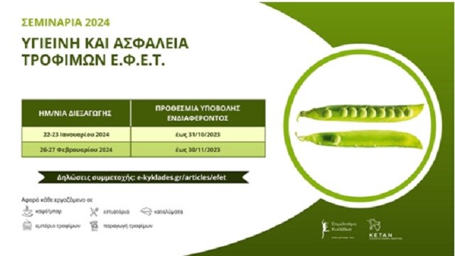 Τη συνέχιση της υποβολής των αιτήσεων για συμμετοχή στα σεμινάρια Υγιεινής & Ασφάλειας Τροφίμων (Ε.Φ.Ε.Τ.) που θα πραγματοποιηθούν και το 2024, κάνει γνωστή, με ανακοίνωσή του, το Επιμελητήριο Κυκλάδων.