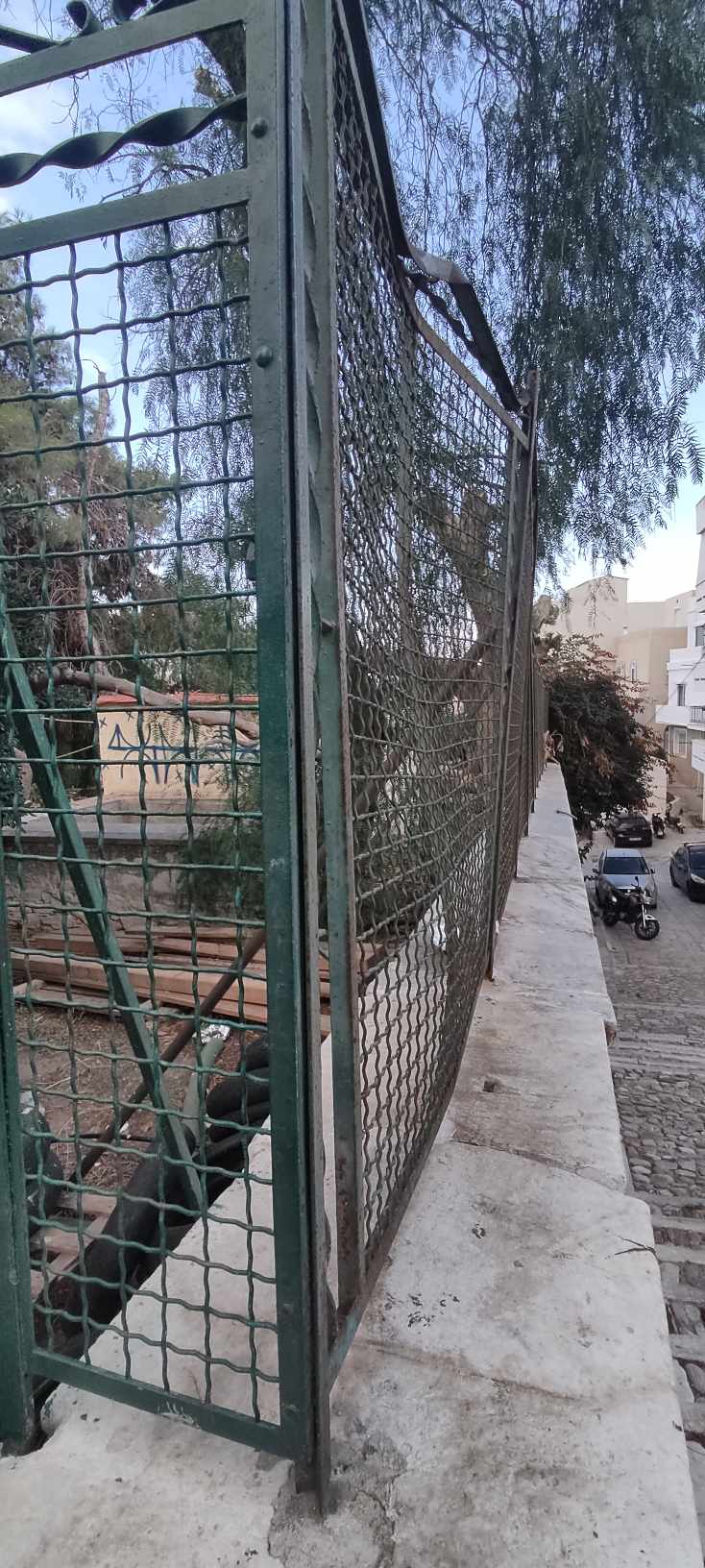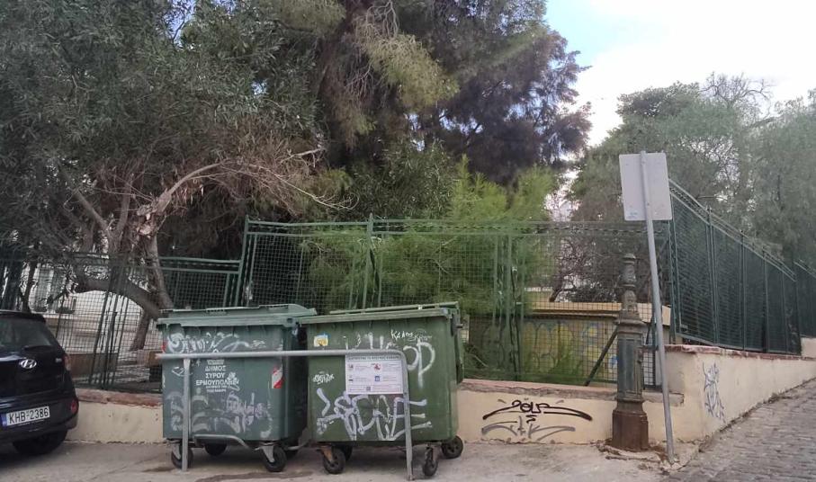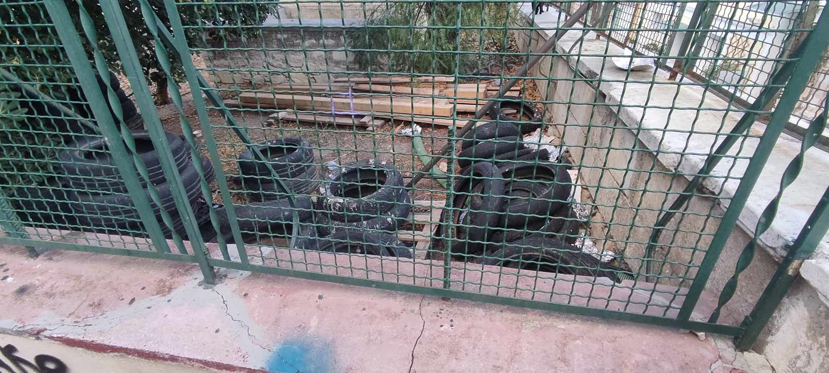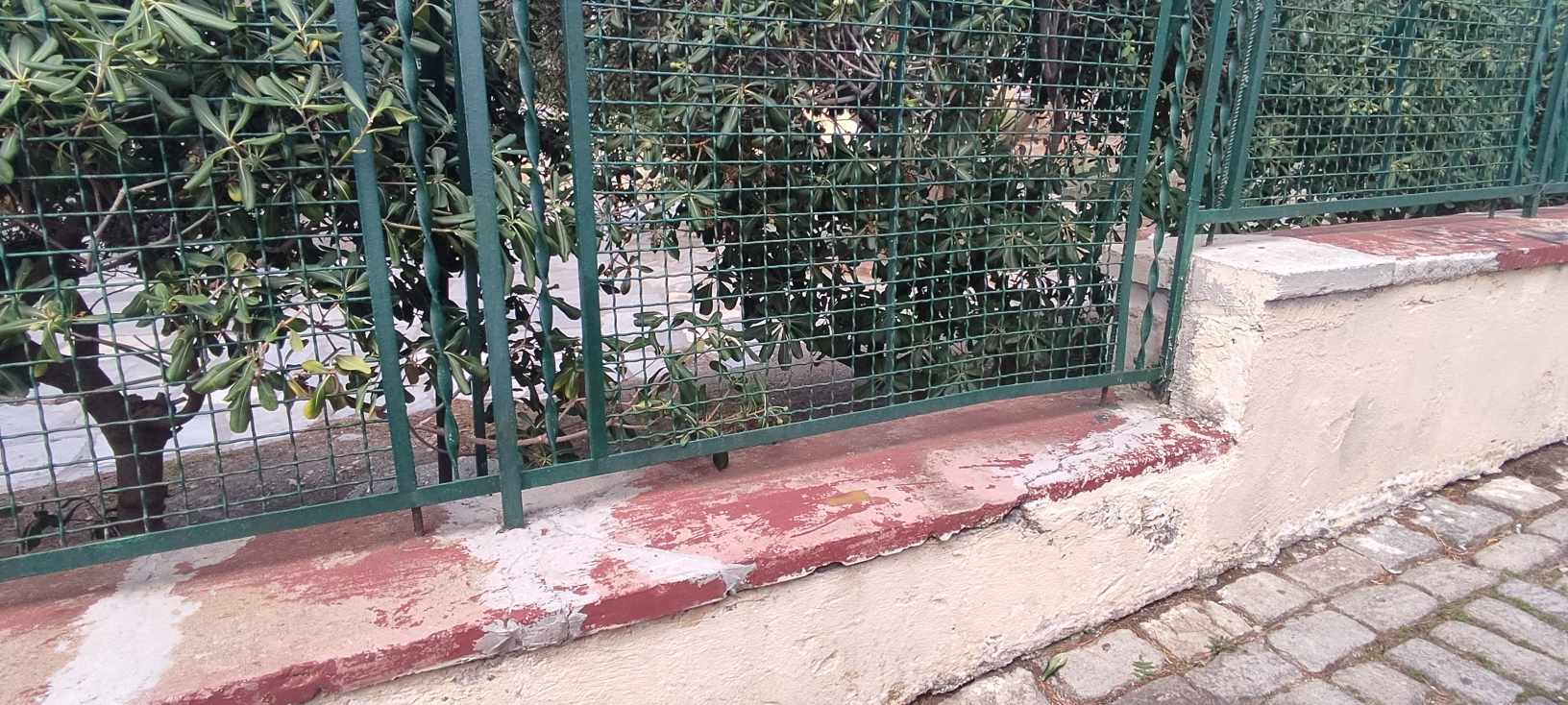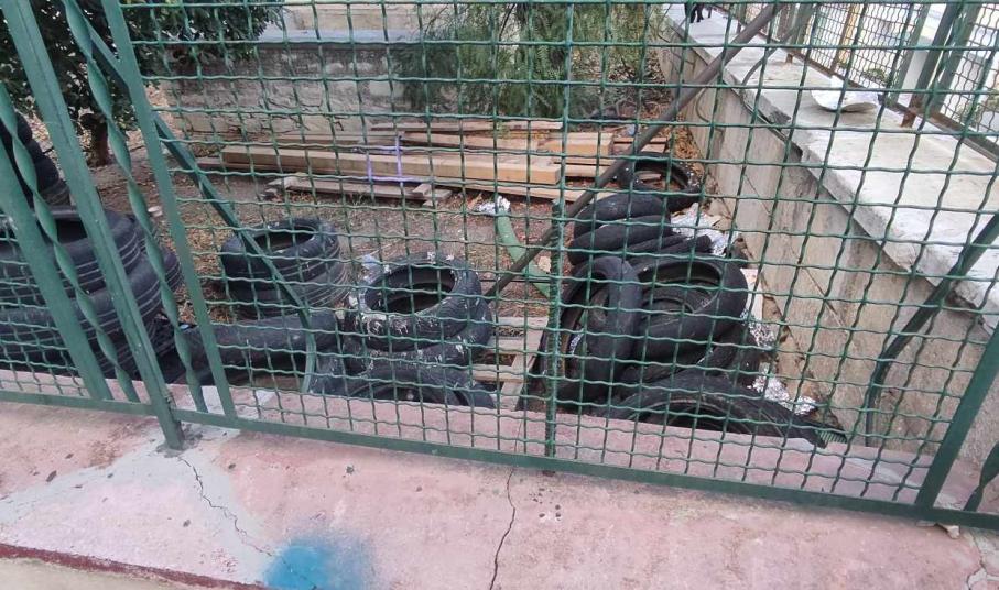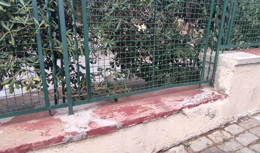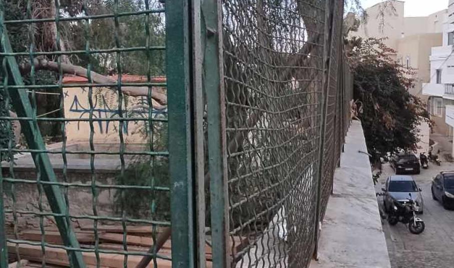 Παράλληλα, ο χώρος δεν έχει φροντιστεί μέσα στα τμήματα που έχει πλάκες, όπως επίσης, φθορές, φέρει τόσο η περίφραξη του, όσο και οι μικρές βάσεις – τοιχία.