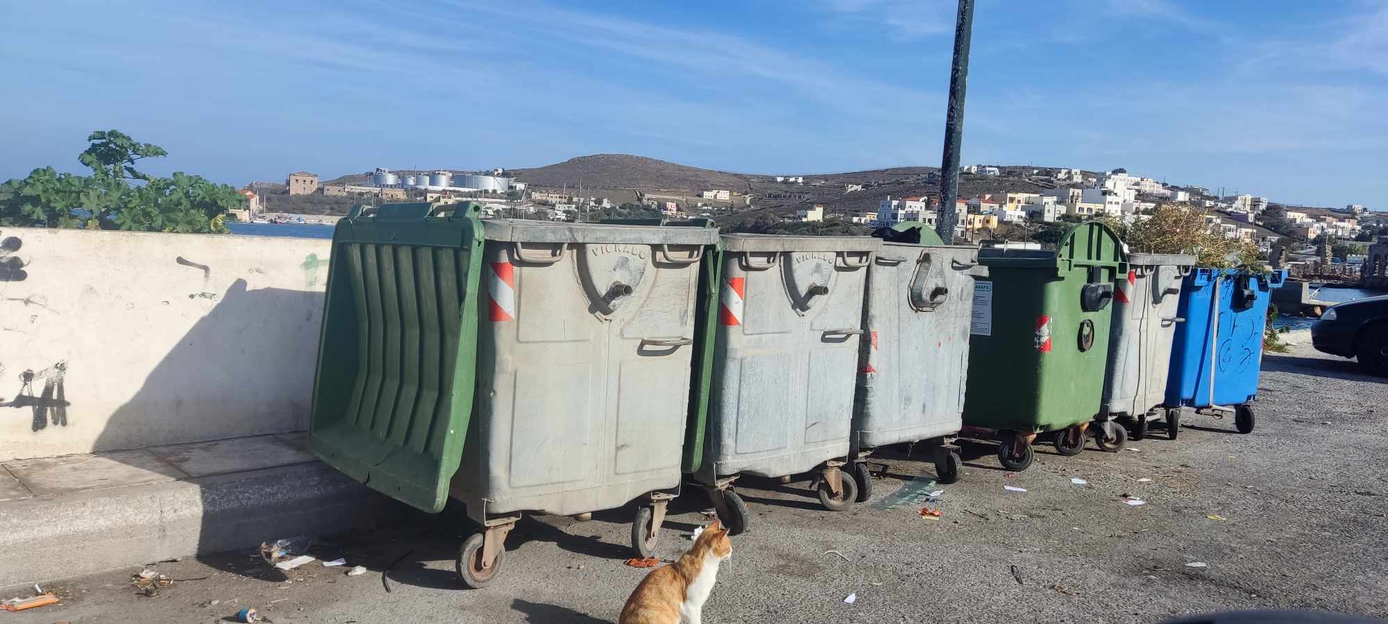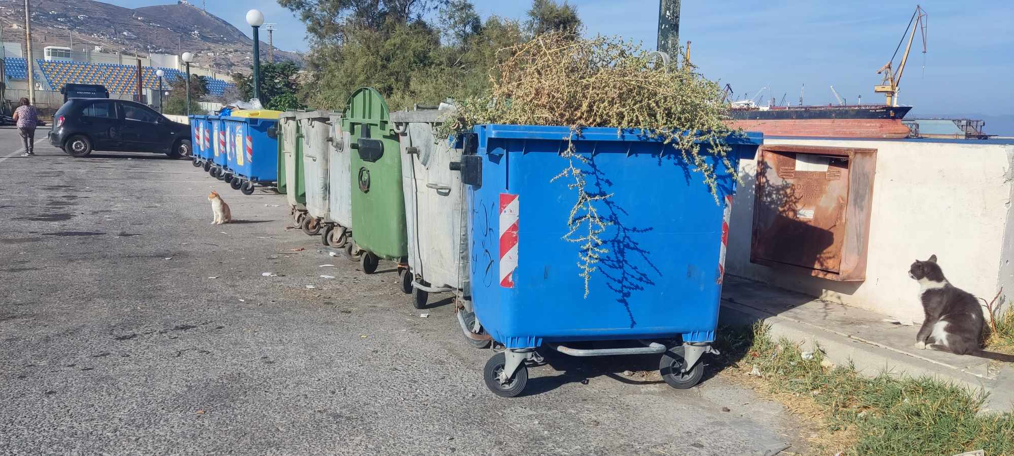 Οι κάδοι παραμένουν ανοικτοί και μάλιστα με “παροπλισμένα” καπάκια, γεγονός που αφήνει τη δυνατότητα στις γάτες να σκίζουν τις σακούλες με τα απορρίμματα.