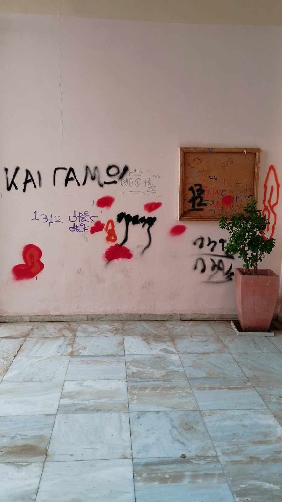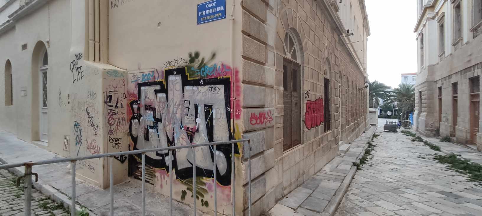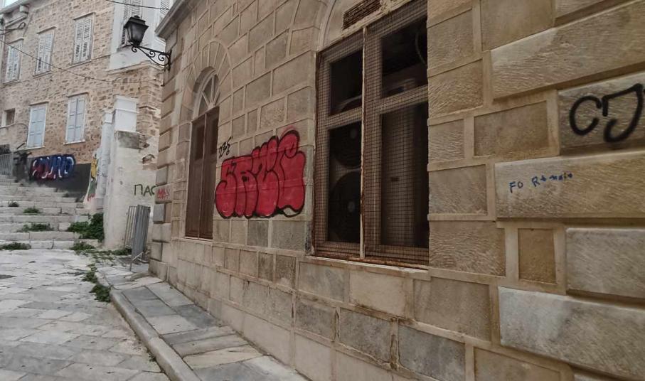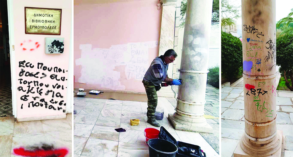 Όλο το τελευταίο διάστημα είναι σε έξαρση οι βανδαλισμοί και οι φθορές με σπρέι και μπογιές στο κέντρο της Ερμούπολης, με μεγάλα “θύματα” να είναι τα ιστορικής και αρχιτεκτονικής αξίας κτήρια, τόσο δημόσια, όσο και ιδιωτικά. Μετά από τις φθορές στο Δημαρχιακό Μέγαρο, στο Πνευματικό Κέντρο, στην Καθολική εκκλησία της Ερμούπολης, στα κουβούκλια των ηλεκτρικών σκούτερ και στη μαρμάρινη εξέδρα της μουσικής στην πλατεία Μιαούλη, πήρε – δυστυχώς – σειρά, η Δημοτική Βιβλιοθήκη.
