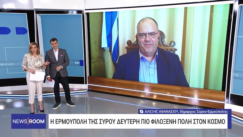 Στην εκπομπή NewsRoom της ΕΡΤ φιλοξενήθηκε σήμερα το πρωί ο δήμαρχος Σύρου - Ερμούπολης, Αλέξης Αθανασίου, με αφορμή τη διάκριση της πόλης και την ανάδειξή της από την booking.com ως τη δεύτερη πιο φιλόξενη πόλη παγκοσμίως (2024) και ως την πρώτη στην Ελλάδα.