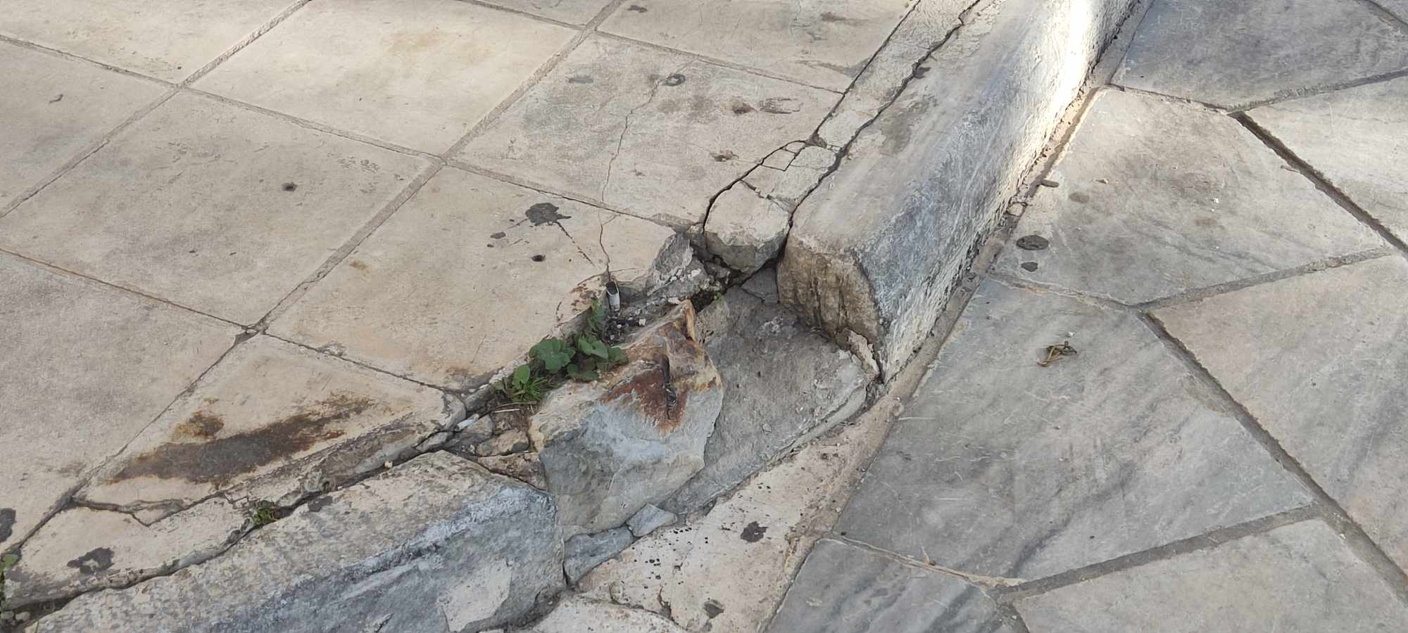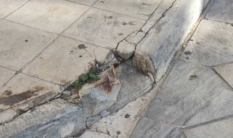 Ειδικότερα, σπασμένα τμήματα μαρμάρων διαπιστώνονται στο πεζοδρόμιο απέναντι από την αφετηρία των ταξί, όλες τις τελευταίες ημέρες, με ορισμένους πολίτες να έχουν χάσει την ισορροπία τους και να έχουν πέσει στον δρόμο. Συγκεκριμένα, μέρος του πεζοδρομίου έχει σπάσει κι έχει αποκολληθεί, με αποτέλεσμα να έχει διαμορφωθεί ανομοιόμορφη επιφάνεια σε αυτό. Μάλιστα, το σπασμένο μέρος δεν έχει απομακρυνθεί από το σημείο, γεγονός που προκαλεί κινδύνους και για οδηγούς μηχανών που δεν θα το παρατηρήσουν τις βραδινές ώρες.