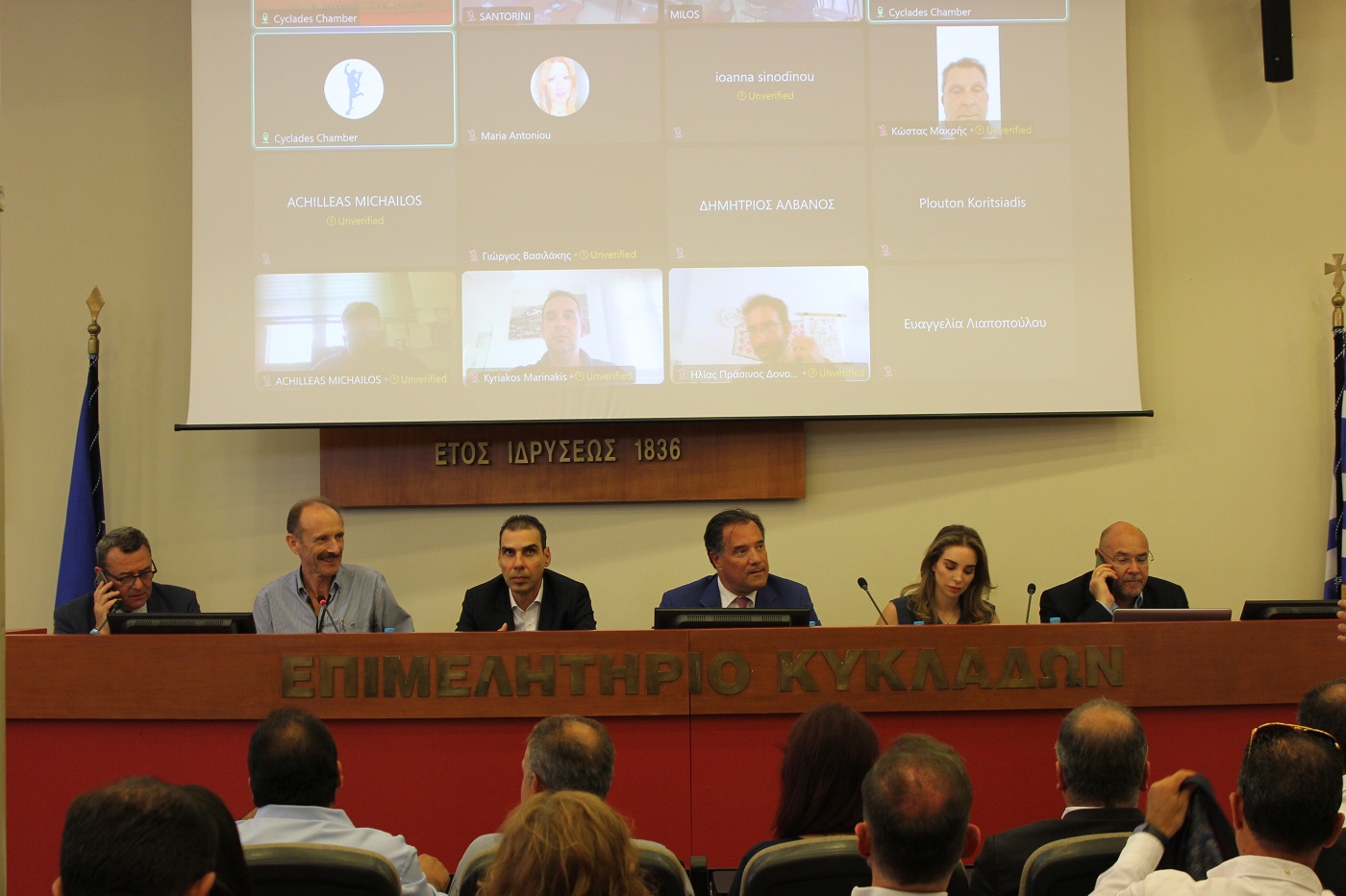 Το μεσημέρι της ίδιας ημέρας, ο κ. Γεωργιάδης με το υπουργικό κλιμάκιο συνάντησαν για τρεις ώρες στο Επιμελητήριο Κυκλάδων όλους τους δημάρχους και τους εκπροσώπους των υγειονομικών δομών (δια ζώσης και με τηλεδιάσκεψη), καταγράφοντας τα προβλήματά τους στο κομμάτι της Υγείας.