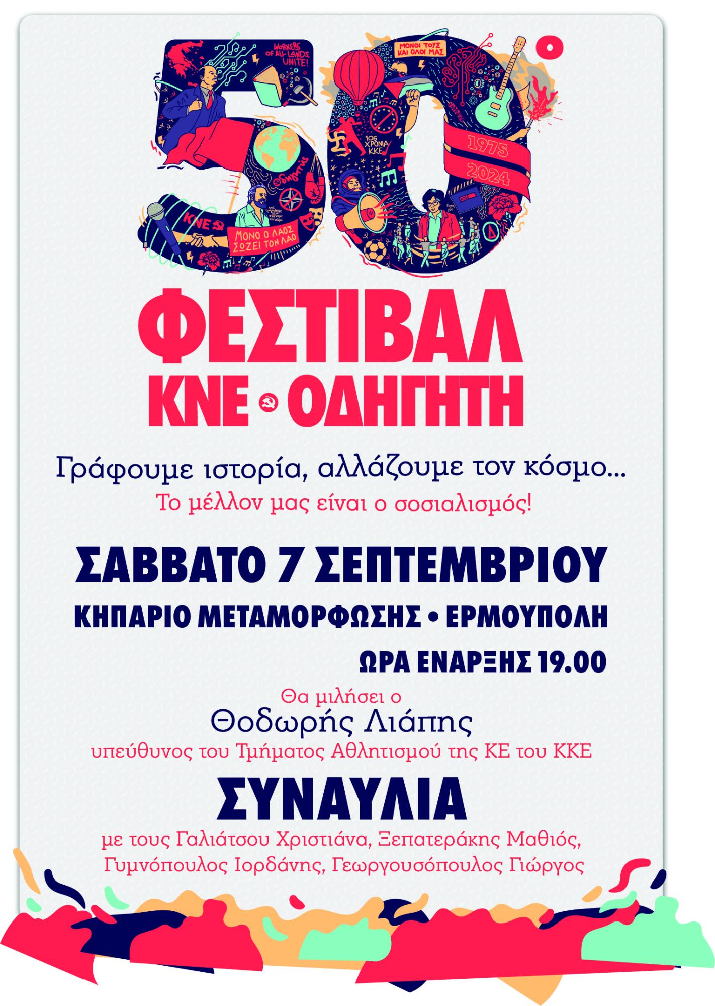 Στη Σύρο και συγκεκριμένα στο κηπάριο της Μεταμόρφωσης, θα πραγματοποιηθεί το Σάββατο 7 Σεπτέμβρη στις 7 το απόγευμα, το 50ο Φεστιβάλ ΚΝΕ – «Οδηγητή», με σύνθημα "Γράφουμε Ιστορία, αλλάζουμε τον κόσμο - Το μέλλον μας είναι ο σοσιαλισμός!".