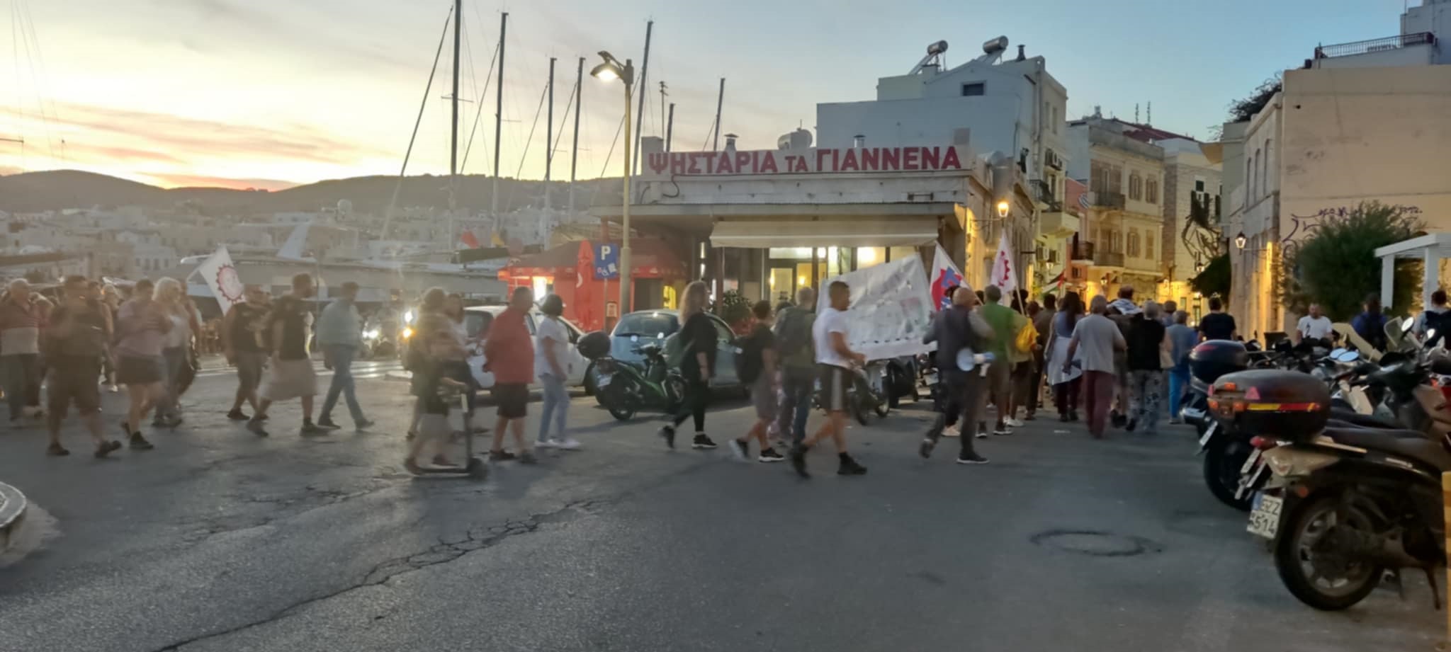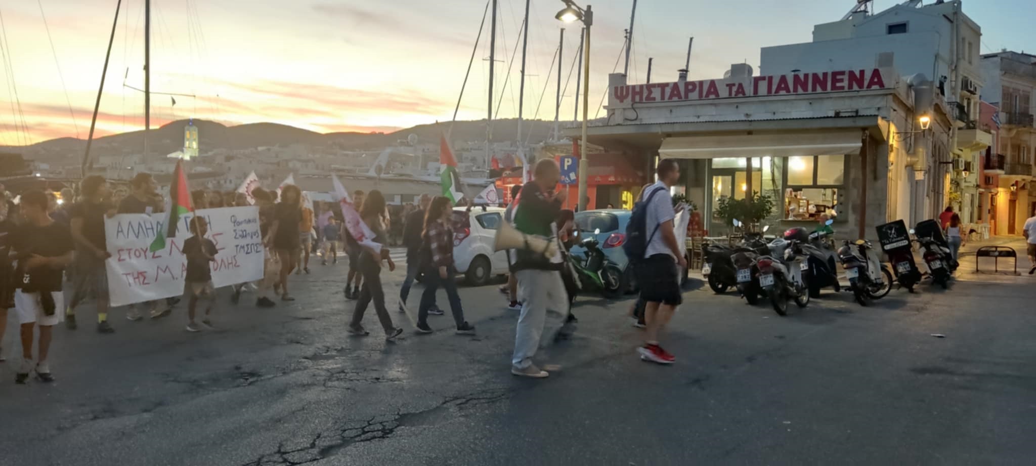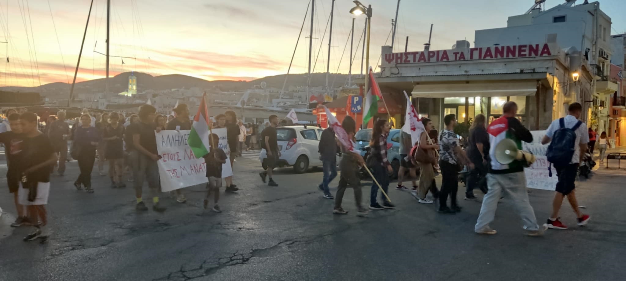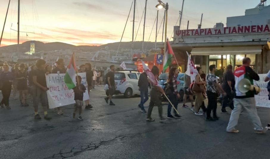 Με κεντρικό σύνθημα “Λευτεριά στην Παλαιστίνη”, μέλη Σωματείων και Συλλόγων στη Σύρο, πραγματοποίησαν χθες το απόγευμα κινητοποίηση αλληλεγγύης προς τους λαούς της Μέσης Ανατολής, με φόντο τον πόλεμο που διεξάγεται.