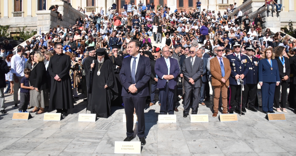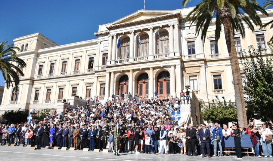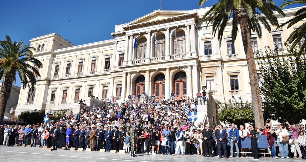 Η παρέλαση στην πλατεία Μιαούλη αποτέλεσε την κορύφωση των επετειακών εκδηλώσεων για την 28η Οκτωβρίου, της οποίας προηγήθηκε η δοξολογία στον Ι.Ν. του Αγίου Νικολάου Ερμούπολης, με τη συμμετοχή πολλών εκπροσώπων της Αυτοδιοίκησης του Α΄ και του Β΄ βαθμού, εκπροσώπων φορέων και κομματικών οργανώσεων, βουλευτών του νομού και εκπροσώπων των Σωμάτων Ασφαλείας.