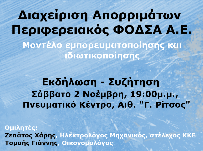Η Λαϊκή Συσπείρωση Σύρου – Ερμούπολης διοργανώνει εκδήλωση- συζήτηση με θέμα "Διαχείριση Απορριμμάτων, Περιφερειακός ΦΟΔΣΑ Α.Ε.: Μοντέλο εμπορευματοποίησης και ιδιωτικοποίησης.