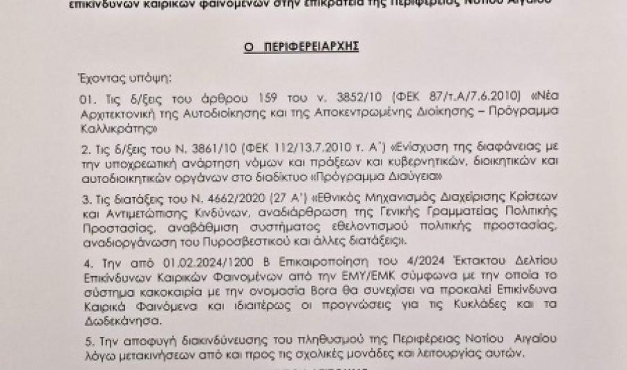 Ο Περιφερειάρχης υπέγραψε τη σχετική απόφαση για την αποφυγή διακινδύνευσης του πληθυσμού της Περιφέρειας Νοτίου Αιγαίου λόγω μετακινήσεων από και προς τις σχολικές μονάδες, μετά και το επικαιροποιημένο Έκτακτο Δελτίο Επικίνδυνων Καιρικών Φαινομένων από την ΕΜΥ/ΕΜΚ, σύμφωνα με το οποίο, το σύστημα κακοκαιρίας με την ονομασία Bora, θα συνεχίσει να προκαλεί επικίνδυνα καιρικά φαινόμενα σε Κυκλάδες και Δωδεκάνησα.
