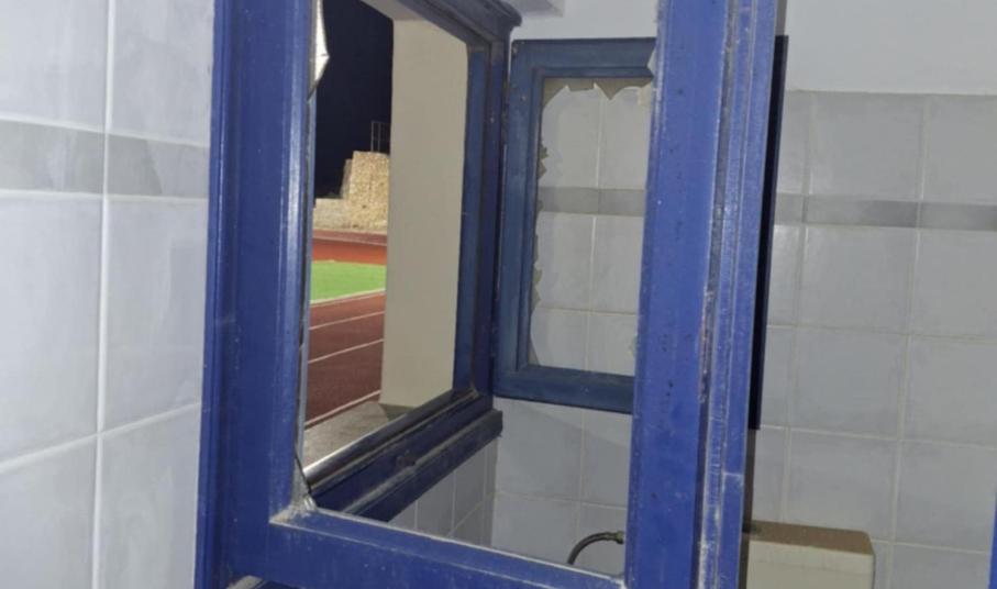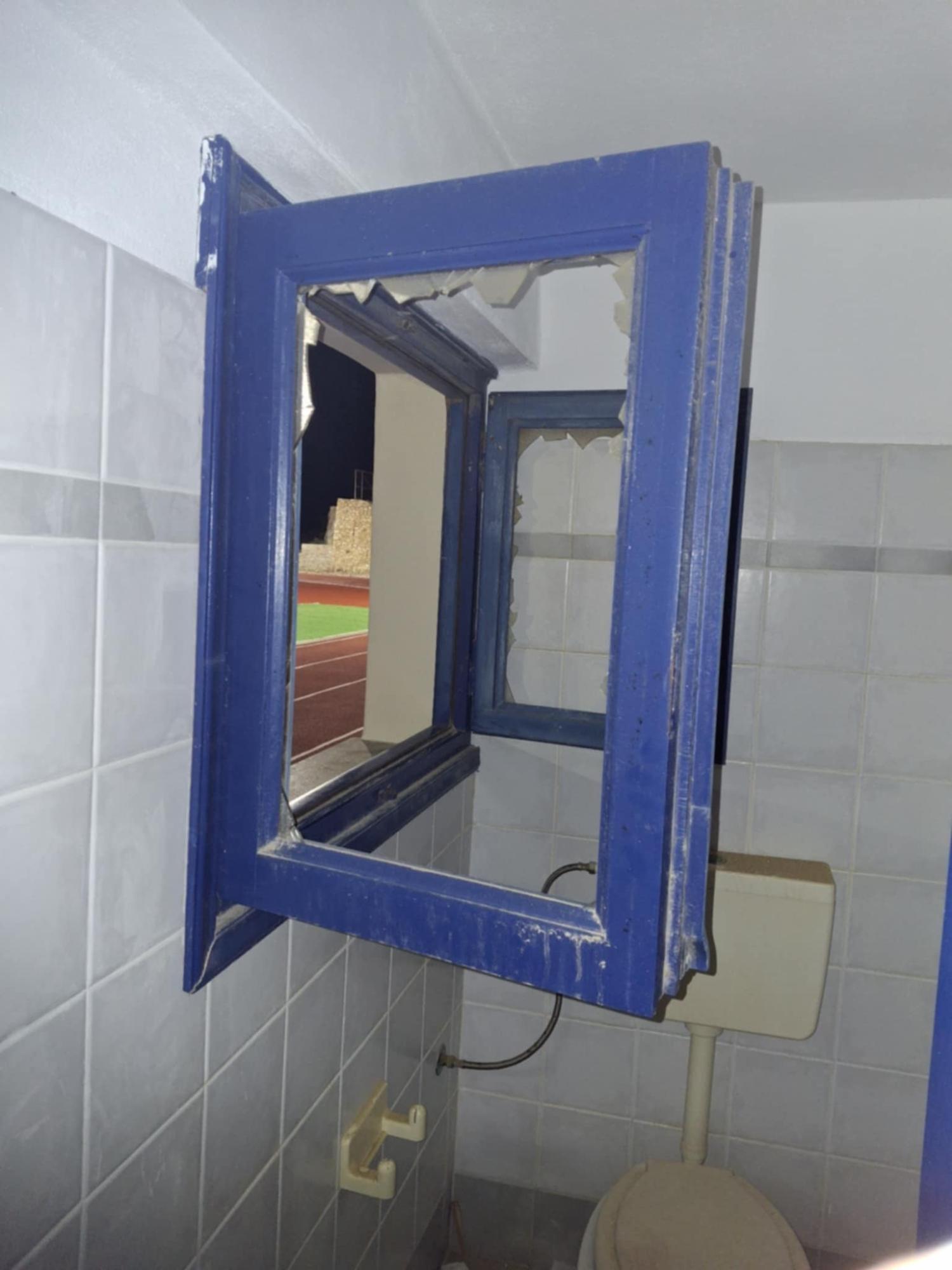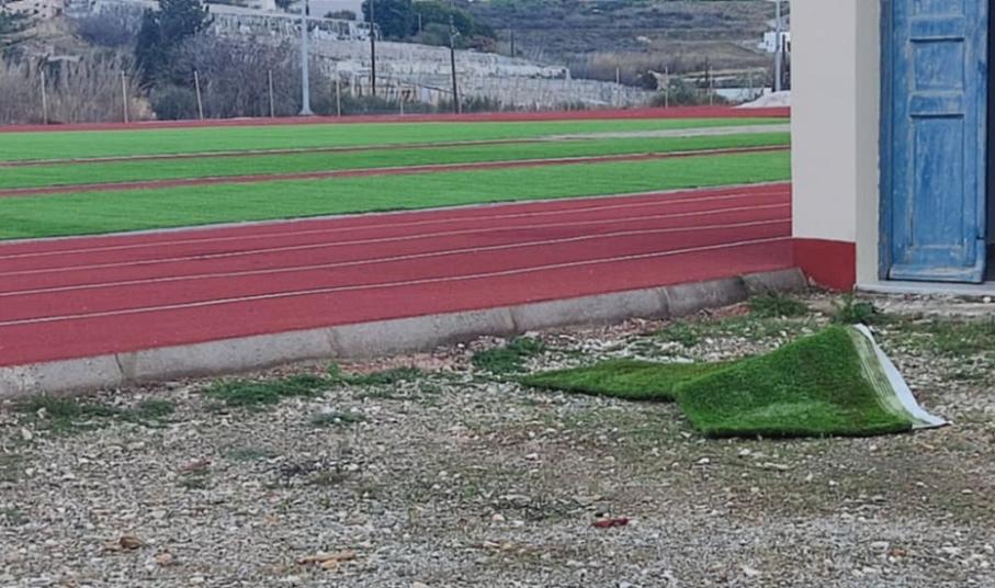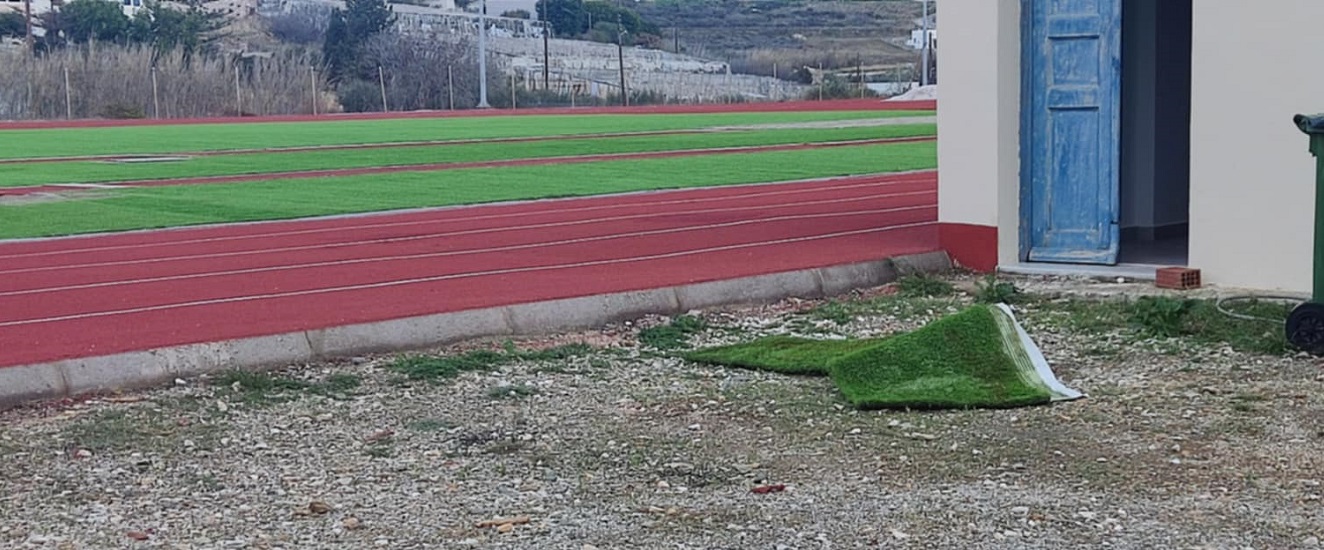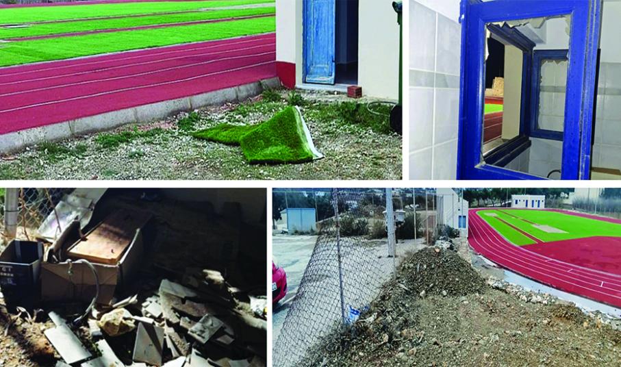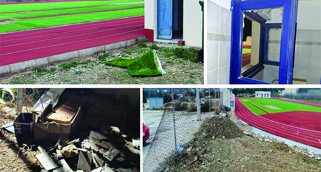 Ειδικότερα, εσωτερικά στο στάδιο, έχει κοπεί και πεταχτεί ένα τμήμα του νέου χλοοτάπητα σε σημείο εκτός χώρων για τα αγωνίσματα, ενώ επιπλέον, οι αποθήκες δεν είναι κλειδωμένες με αποτέλεσμα να πετάγονται διάφορα αντικείμενα. Επιπλέον, ασυνείδητοι έχουν σπάσει τα τζάμια από τα παράθυρα και στον κυρίως χώρο για το τρέξιμο, έχουν αφεθεί δύο μικρά “βουνά” από χαλίκι και άμμο.
