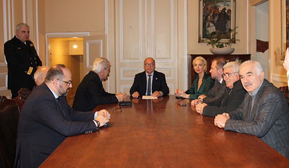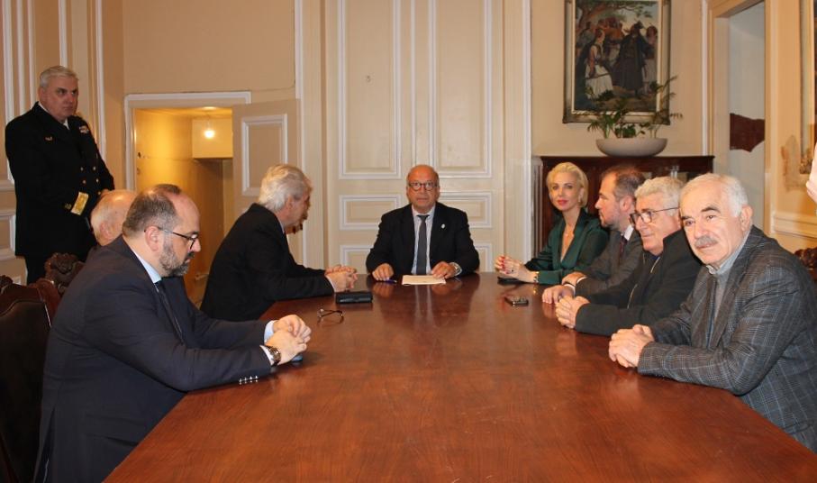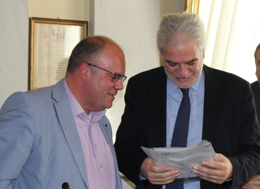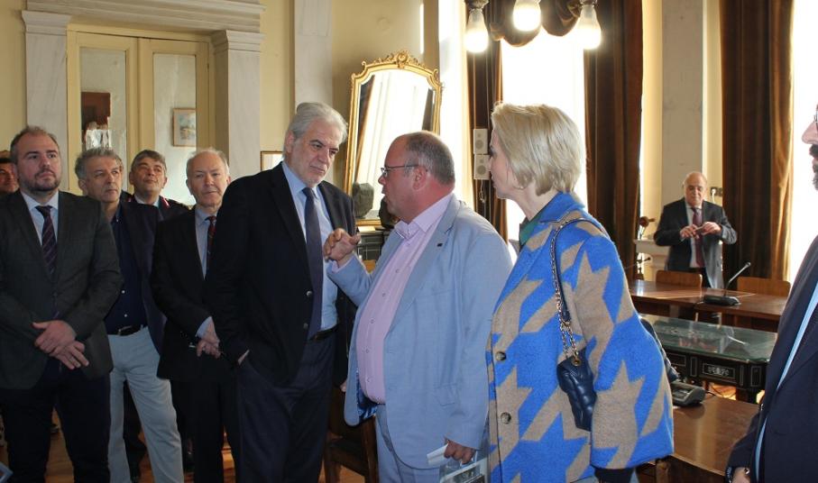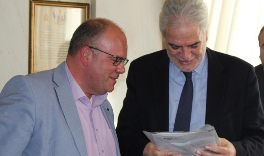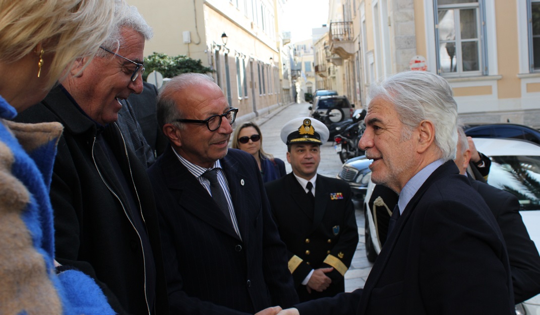 Από τον δήμαρχο Σύρου - Ερμούπολης, Αλέξη Αθανασίου και τον αντιπεριφερειάρχη Κυκλάδων, Γιώργο Λεονταρίτη προς τον Χρήστο Στυλιανίδη που επισκέφθηκε τη Σύρο