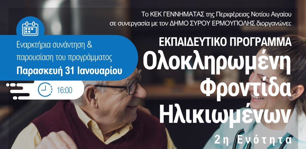 Σήμερα Πέμπτη 30 Ιανουαρίου 2025 λαμβάνει χώρα με επιτυχία το πέρας της 1ης ενότητας - από τις τρεις συνολικά - του Εκπαιδευτικού Προγράμματος «Ολοκληρωμένη Φροντίδα Ηλικιωμένων», που υλοποιεί στη Σύρο το ΚΕΚ Γεννηματάς της Περιφέρειας Νοτίου Αιγαίου, σε συνδιοργάνωση με τον Δήμο Σύρου – Ερμούπολης.