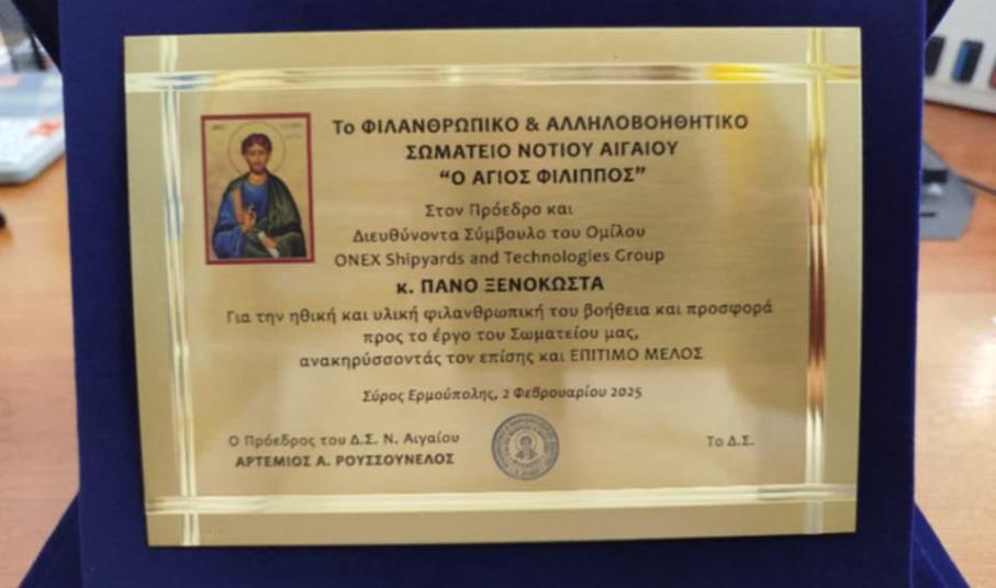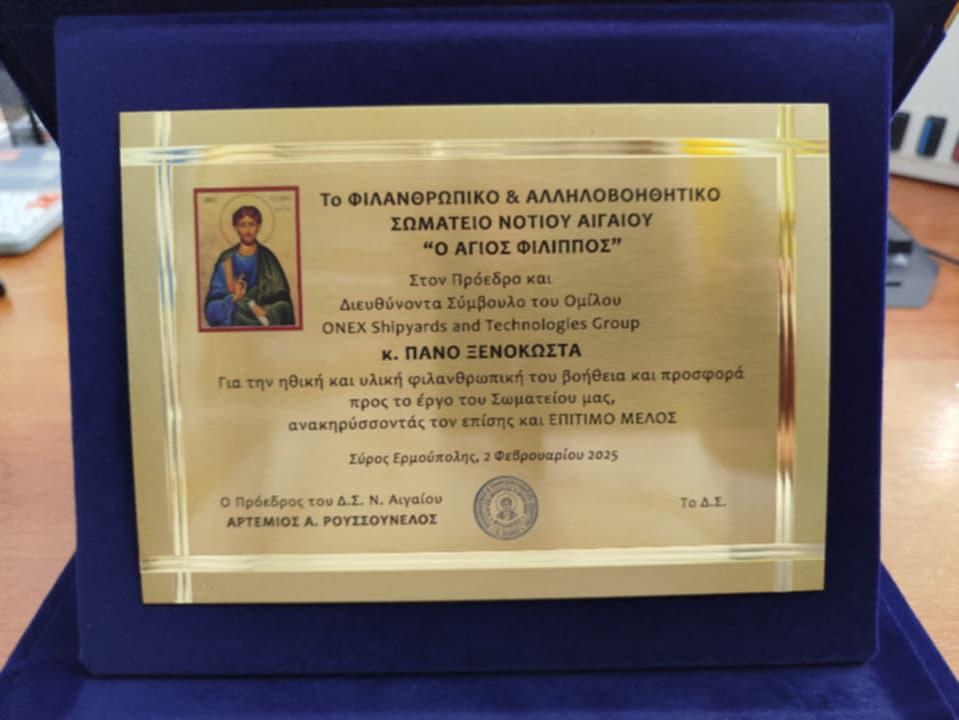 Ο Πρόεδρος & Δ/νων Σύμβουλος του Ομίλου ONEX κ. Πάνος Ξενοκώστας για την ηθική και υλική προσφορά του και την εν γένει συνεισφορά του προς το Σωματείο μας.