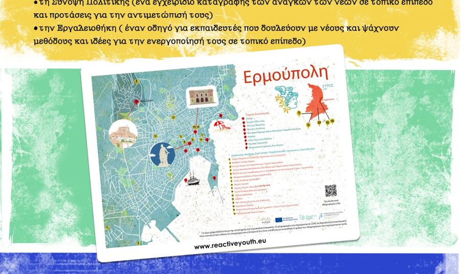 Ανακαλύψτε τον ηλεκτρονικό χάρτη στην ιστοσελίδα του έργου: www.reactiveyouth.eu (στη σελίδα: Αποτελέσματα). Εκεί μπορείτε να εξερευνήσετε όχι μόνο την Ερμούπολη αλλά και τους χάρτες άλλων περιοχών των εταίρων του έργου σε Ισπανία, Πορτογαλία, Ιταλία, Σλοβενία και Αυστρία. Παράλληλα μπορείτε να κατεβάσετε τη Σύνοψη Πολιτικής και την Εργαλειοθήκη, εγχειρίδια με πλούσιο υλικό για εκπαιδευτικούς ή άλλους επαγγελματίες που δουλεύουν με νέους και θα ήθελαν να διοργανώσουν παρόμοια εργαστήρια.