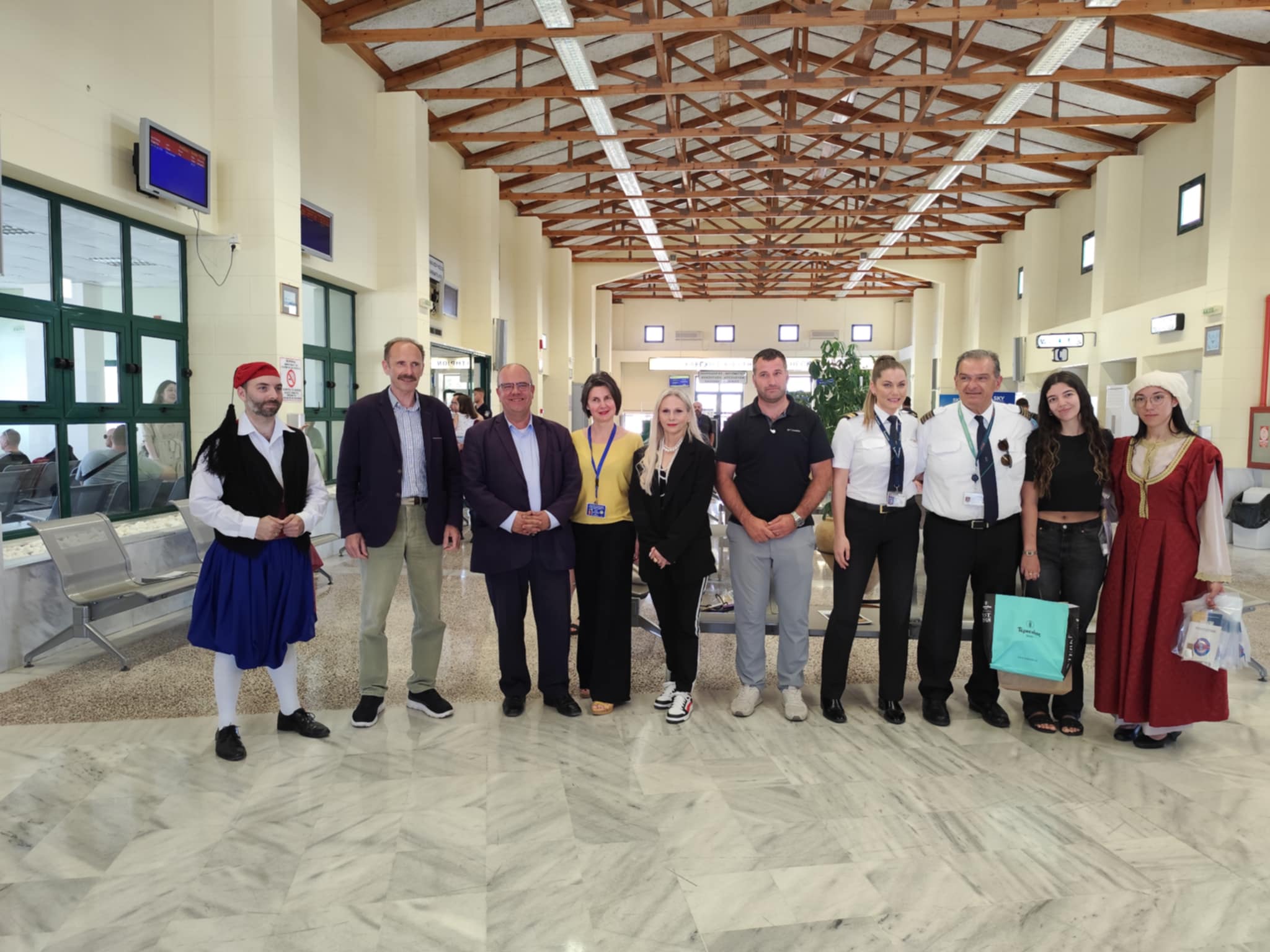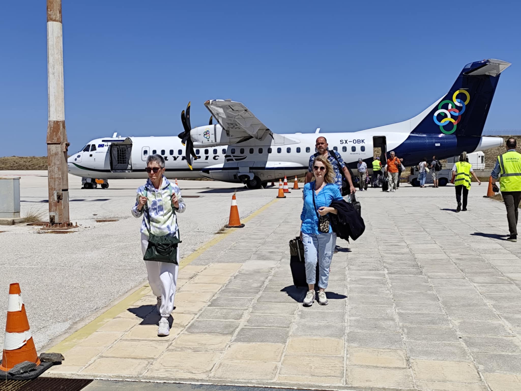 Στο αεροδρόμιο υποδέχθηκαν τον κυβερνήτη, τη συγκυβερνήτη, καθώς και τους επισκέπτες, ο δήμαρχος Σύρου - Ερμούπολης, Αλέξης Αθανασίου, ο αντιδήμαρχος Τουρισμού, Γιάννης Βουτσίνος, η αερολιμενάρχης, Βίκυ Πρέκα, καθώς και ο πρόεδρος του Επιμελητηρίου Κυκλάδων, Γιάννης Ρούσσος. Σημειώνεται πως υπήρξε και εκπρόσωπος της εταιρείας Zela Aviation, με την οποία συνεργάζεται η Δημοτική Αρχή στην προσπάθειά της να αποκτήσει σύνδεση με άλλους προορισμούς. Στους επισκέπτες διανεμήθηκαν παραδοσιακά γλυκίσματα του τόπου (λουκούμι και χαλβαδόπιτα), με ενημερωτικό φυλλάδιο με QR code για να επισκεφθούν τις σελίδες του Δήμου.